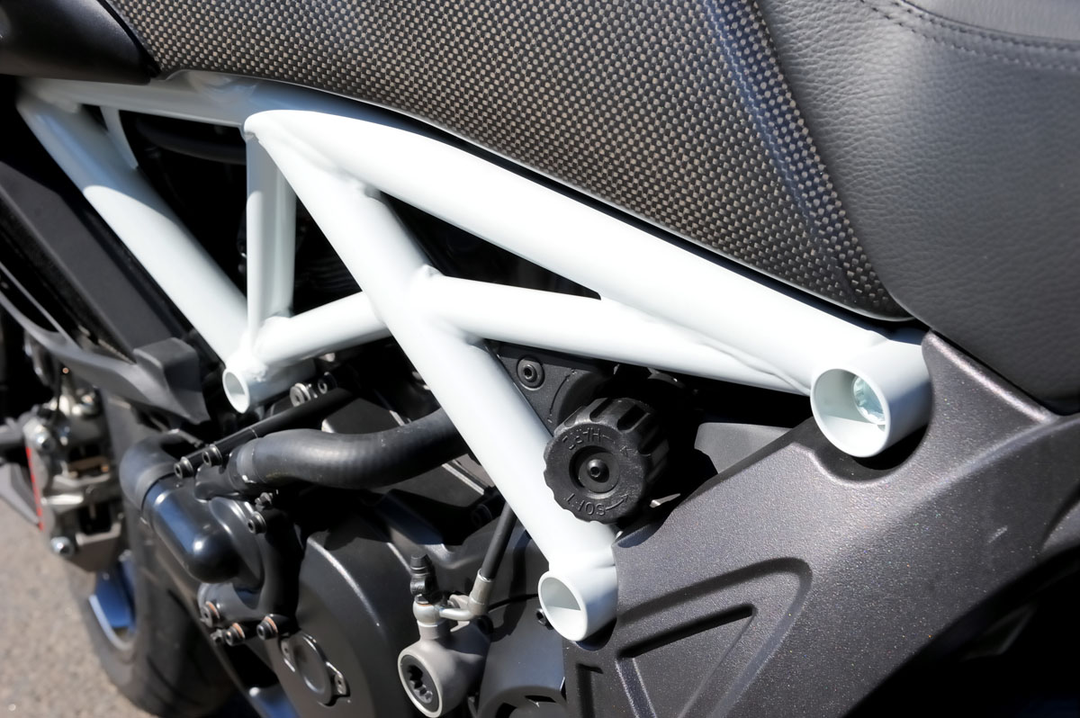The seat cowl is also removable with the tool kit under the seat, while the pillion pegs can be extended out and a rear grab rail extended from below the seat to ensure a pillion is comfortable and doesn’t fall off the back the first time you open the throttle.