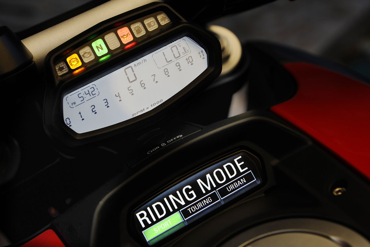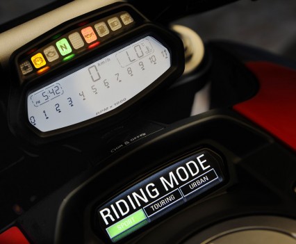 Sport, Touring and Urban are the three options, with Sport providing full power sportsbike-like delivery, Touring also taking advantage of the full 162hp and a more progressive power delivery, while Urban is limited to 100hp and power delivery more suited to busy city streets with a bit more grunt right down low. The DTC is also automatically set according to your riding mode, although this can be modified via the ‘bar controls. The Ride-by-Wire can likewise be set for each mode and controls power delivery.