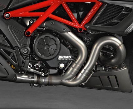 Powering the Ducati Diavel is the Testrastretta 11L-twin Desmodromic Dual Spark engine, which has been specially refined with cam timing that gives it the 11 valve overlap angle for smoother and more linear power, while maintaining the superbike power and providing a greater range of usable torque for ridability. Power maxes out at 162hp with an extremely linear power curve, with power tapering off just after the 9000rpm mark, while torque tapers off earlier at 8000rpm with 94ft-lbs and coming on extremely strong right from cracking the throttle.