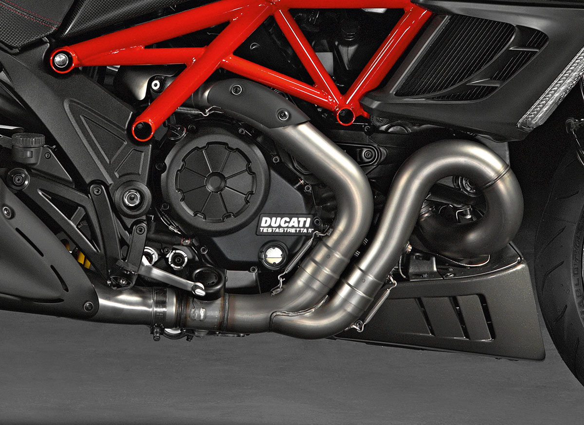 ENGINE: Liquid-cooled, Testastretta 11, L-Twin cylinder, four-valve per cylinder, Desmodromic, 1198.4cc, 106 x 67.9mm bore x stroke, 11.5:1 compression, Mitsubishi EFI, Mikuni elliptical throttle bodies with RbW, two-into-one-into-two lightweight exhaust with cat and lambda probes, twin aluminium mufflers