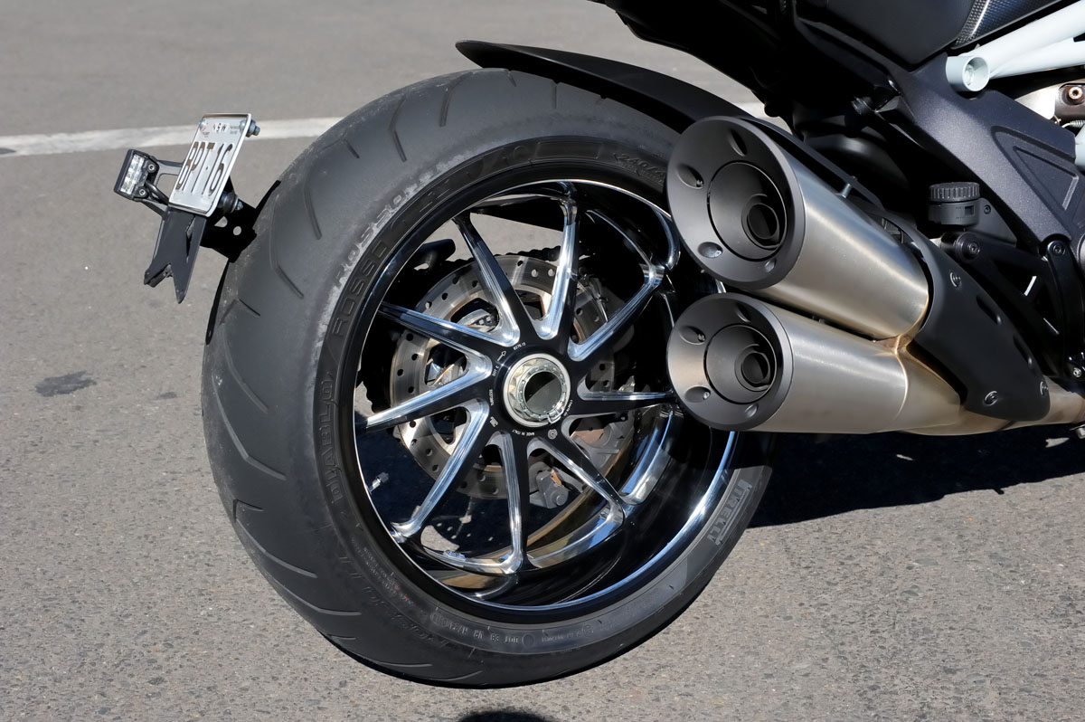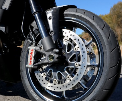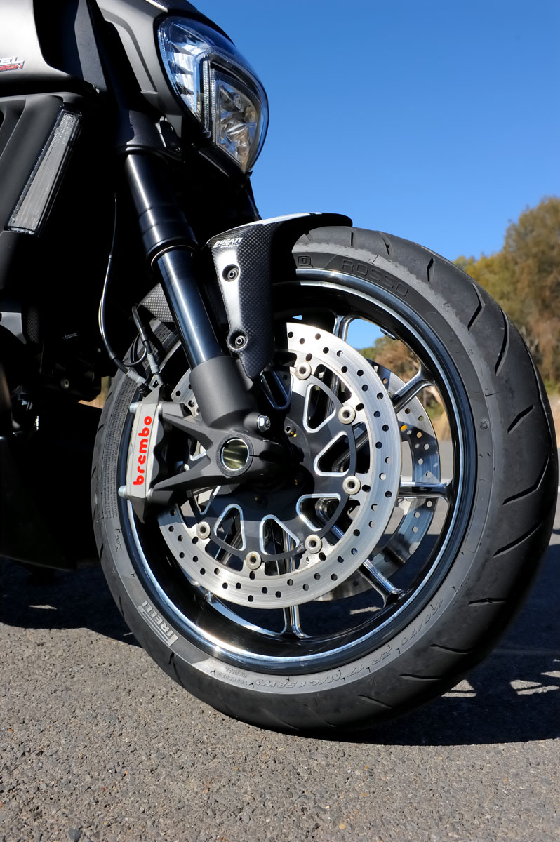 Braking is taken care of by Brembo four-piston Monobloc radial calipers with dual 320mm semi-floating rotors and a rear two-piston floating caliper with 265mm rotor. A Ducati Bosch-Brembo ABS system is standard. The rotor carriers are also milled aluminium with natural aluminium recesses and a black finish to match the rest of the bike.