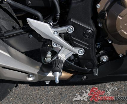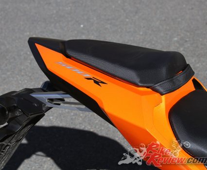 The seat has also been revised and offers a broad comfortable perch at the low seat height of 785mm. Both rider and pillion ‘pegs are also smaller items, with the rider ‘pegs benefiting from rubber grips and offering good feel, although you don’t need to lean the CBR500R over a great deal to get a toe or the hero blobs touching down.
