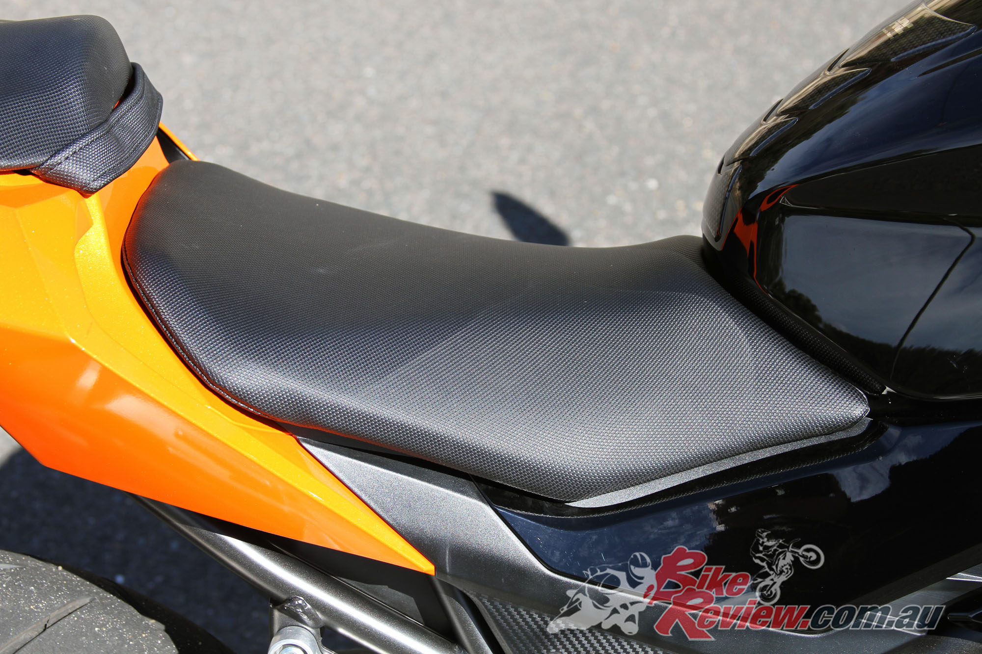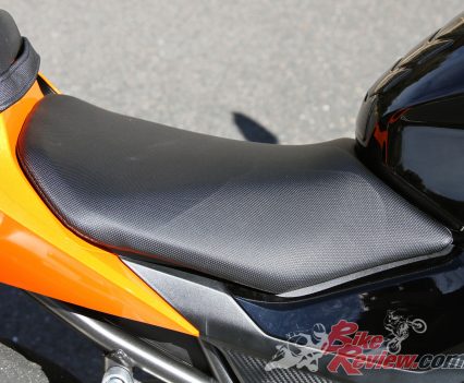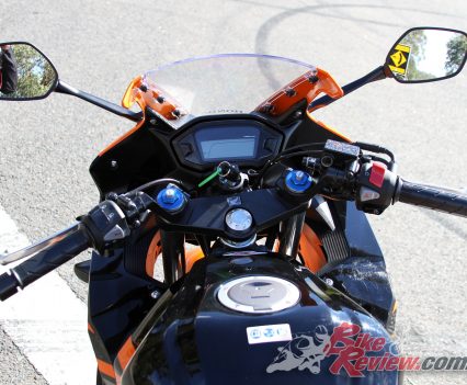 The candy orange paintwork on the model tested is particularly noteworthy and received many compliments, with stickers helping carry the theme through the tank – under the clear coat, while high quality stickers over the fairings are removable but compliment the fairing lines well.