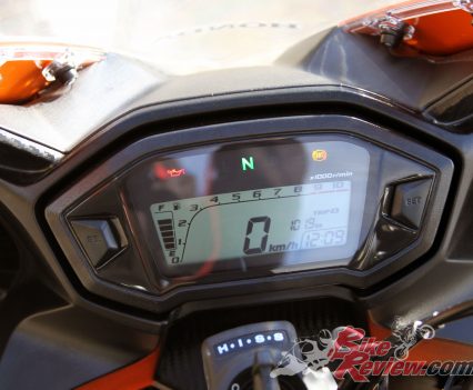 Jumping on board you’ll discover that while the styling is sporty, Honda have maintained the more upright seating position and ‘bar reach, which offer a more neutral and less forward-committed feel to the bike, and you’ll really need to tuck in to get behind the screen at highway speeds.