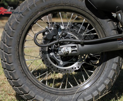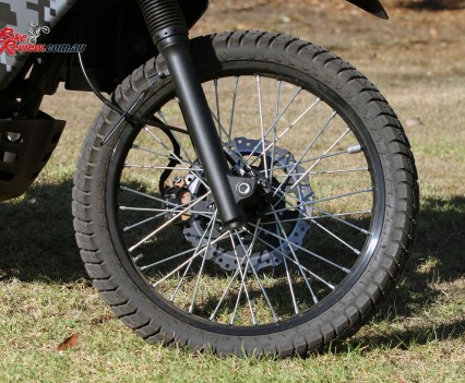 There is 200mm of travel available at the front and 185mm at the rear, for those off road stinks, and the front wheel is a nice big 21in spoked item with a 90/90-21 tyre. The back wheel is a spoked 17in with a 130/80-17 road trail tyre, swinging off an alloy swingarm.