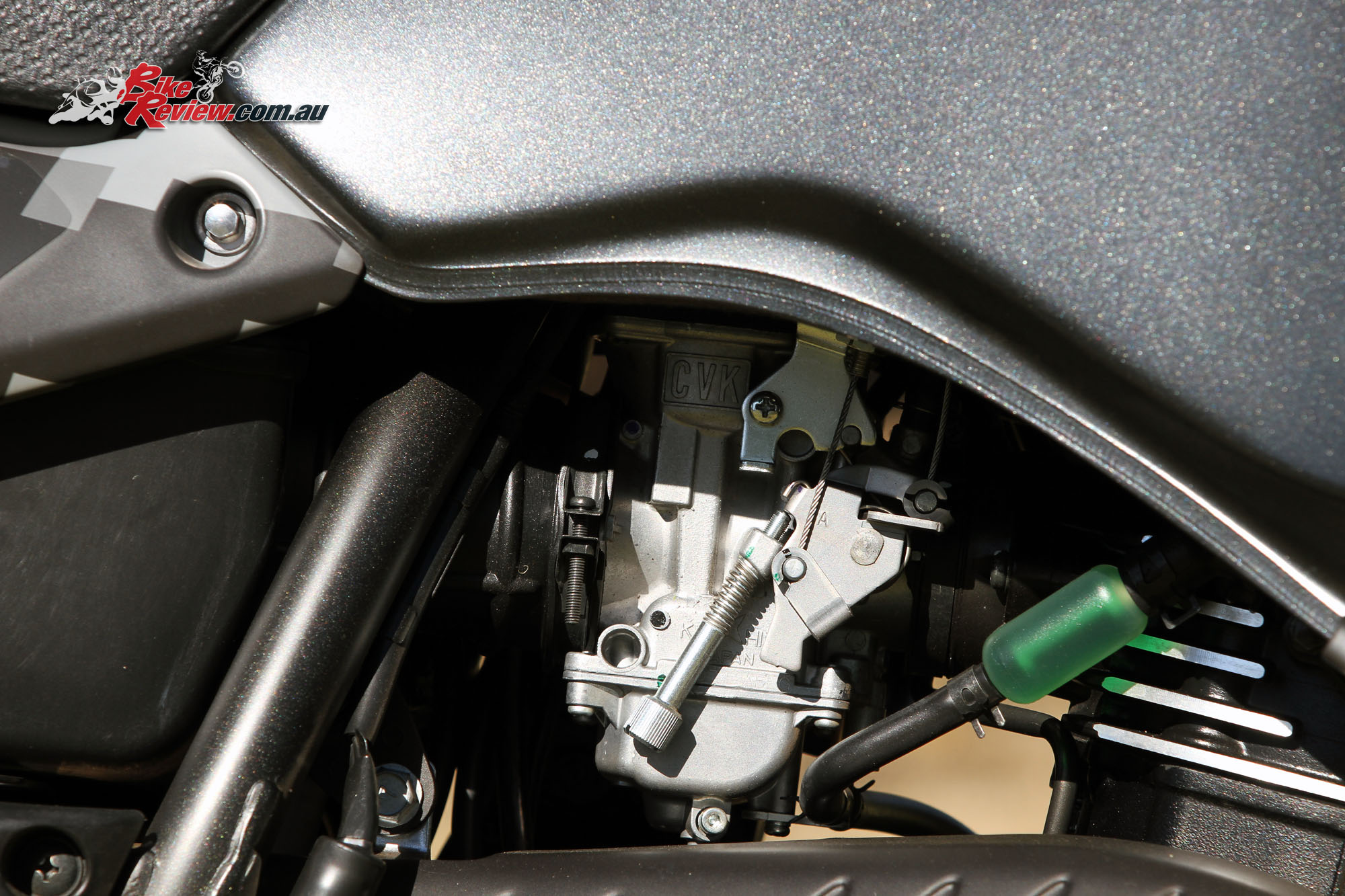 So what is the KLR650 made of? First of all it is powered by a liquid-cooled 651cc four-valve single-cylinder DOHC four-stroke engine with a five-speed wide ratio gearbox. The engine is fed by a 40mm CV carburettor (remember those things?) and has a transistor ignition, as well as electric start.