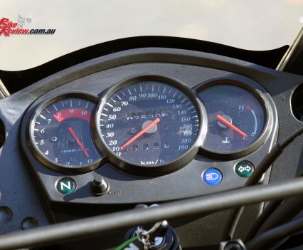 Instruments: Analogue speedo, tacho, water temp, odo, trip, warning lights.