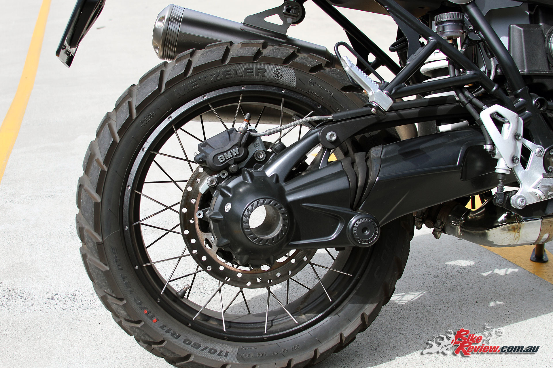 Cast wheels are standard with these black anodised cross spoked wheels optional equipment, with a 3.00in x 19in front wheel, and 4.50in by 17in rear wheel. Off-road tyres as tested are available as a free option instead of standard road tyres.
