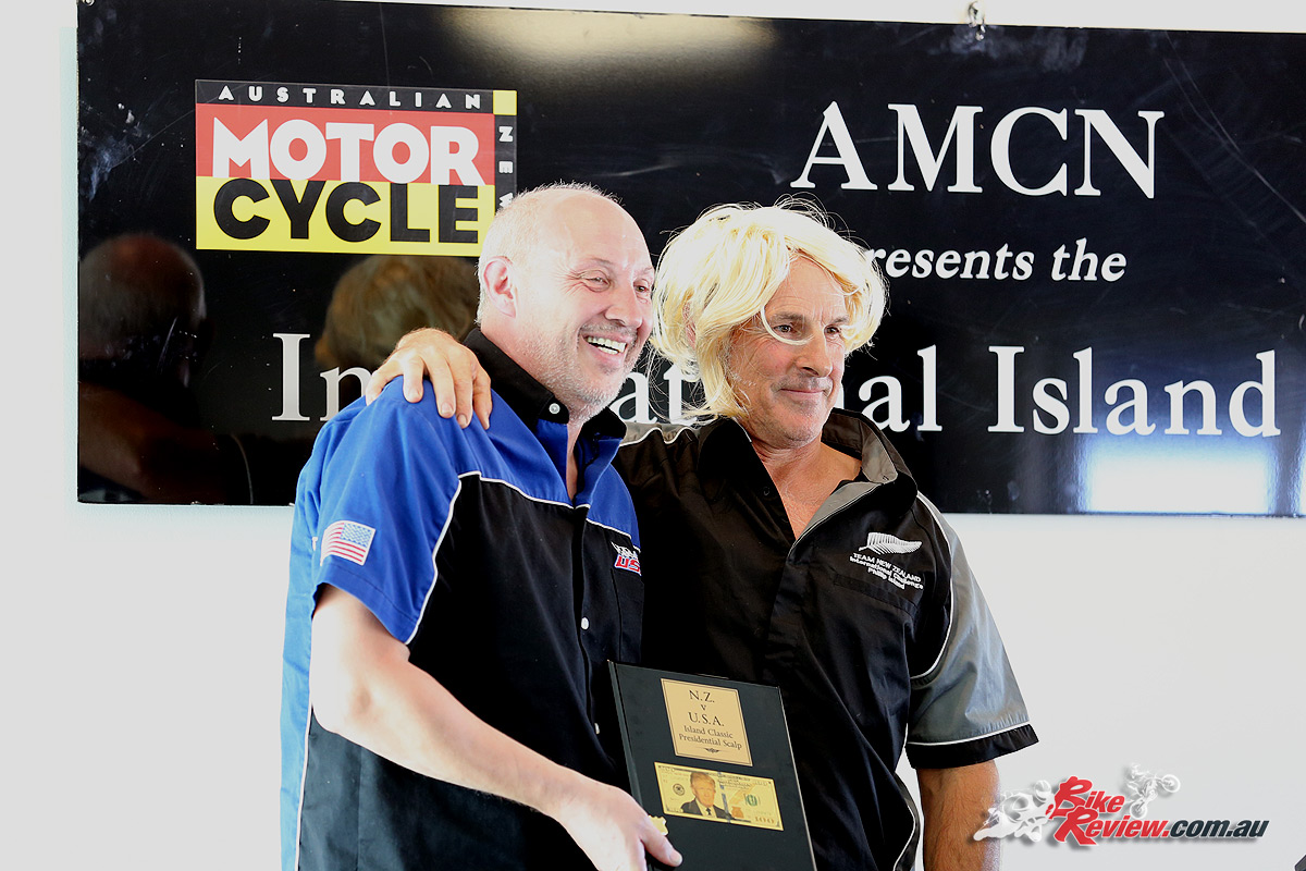 2017 Island Classic Award Ceremony – American captain Dave Crussell, New Zealand captain Duncan Coutts with the Island Classic Presidential Scalp trophy