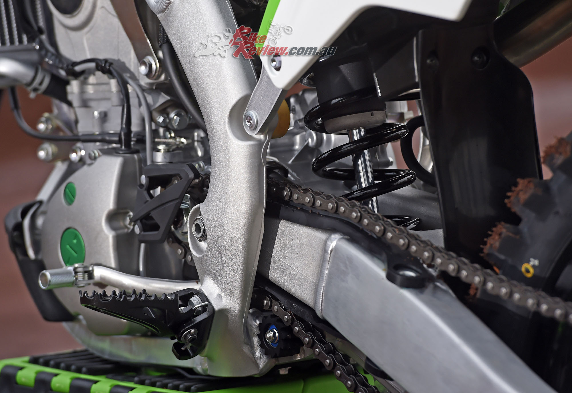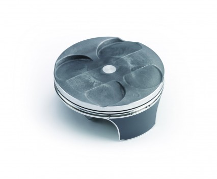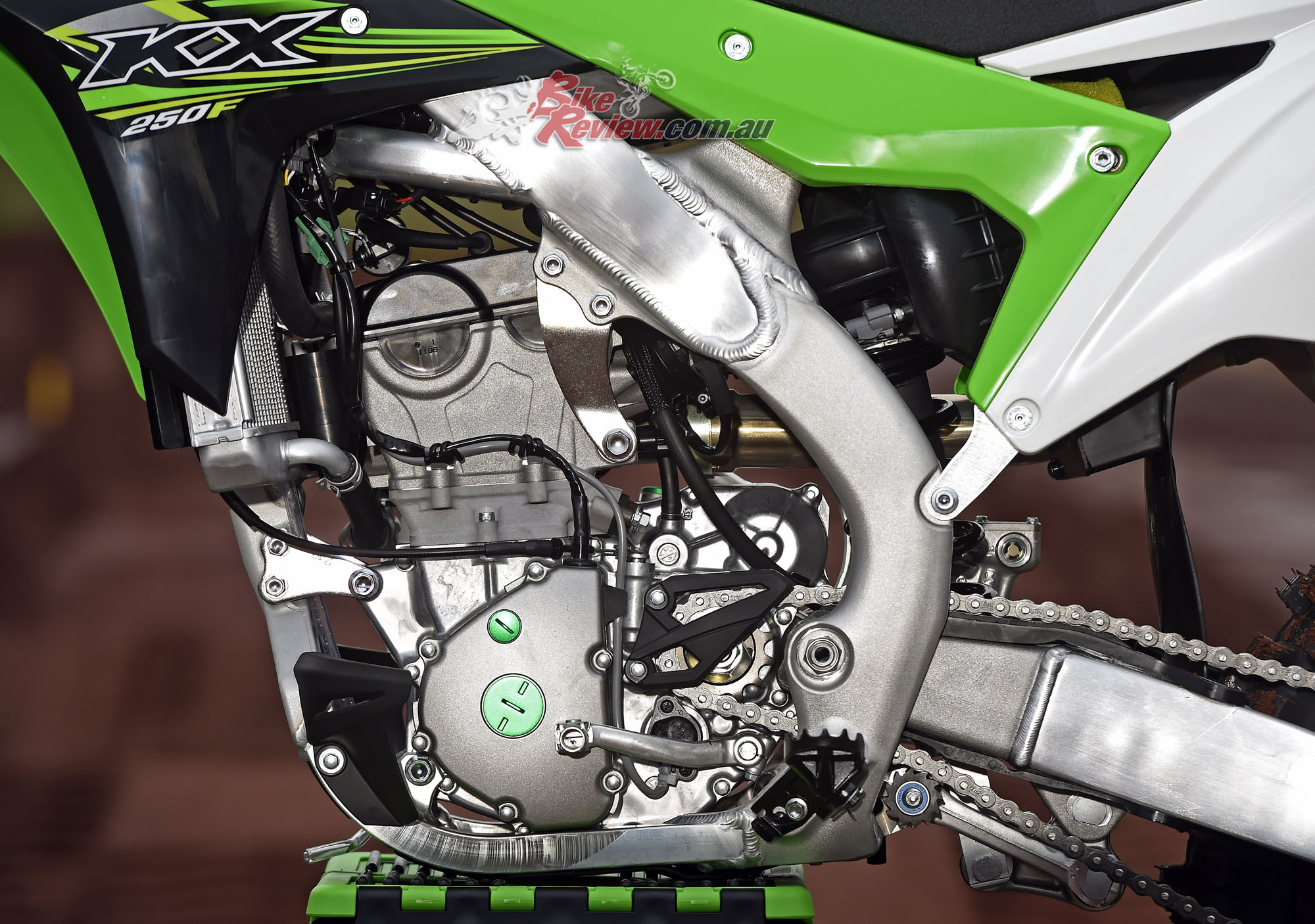 Kawasaki’s KX250F has a box type piston, which means these pistons have very short skirts, reducing weight and giving the motor the ability to rev out much quicker. The piston coating has been changed to molybdenum for increase wear resistance. Above the pistons are four titanium valves. Inlet valves are large 31mm items while exhaust valves are 25mm in diameter.