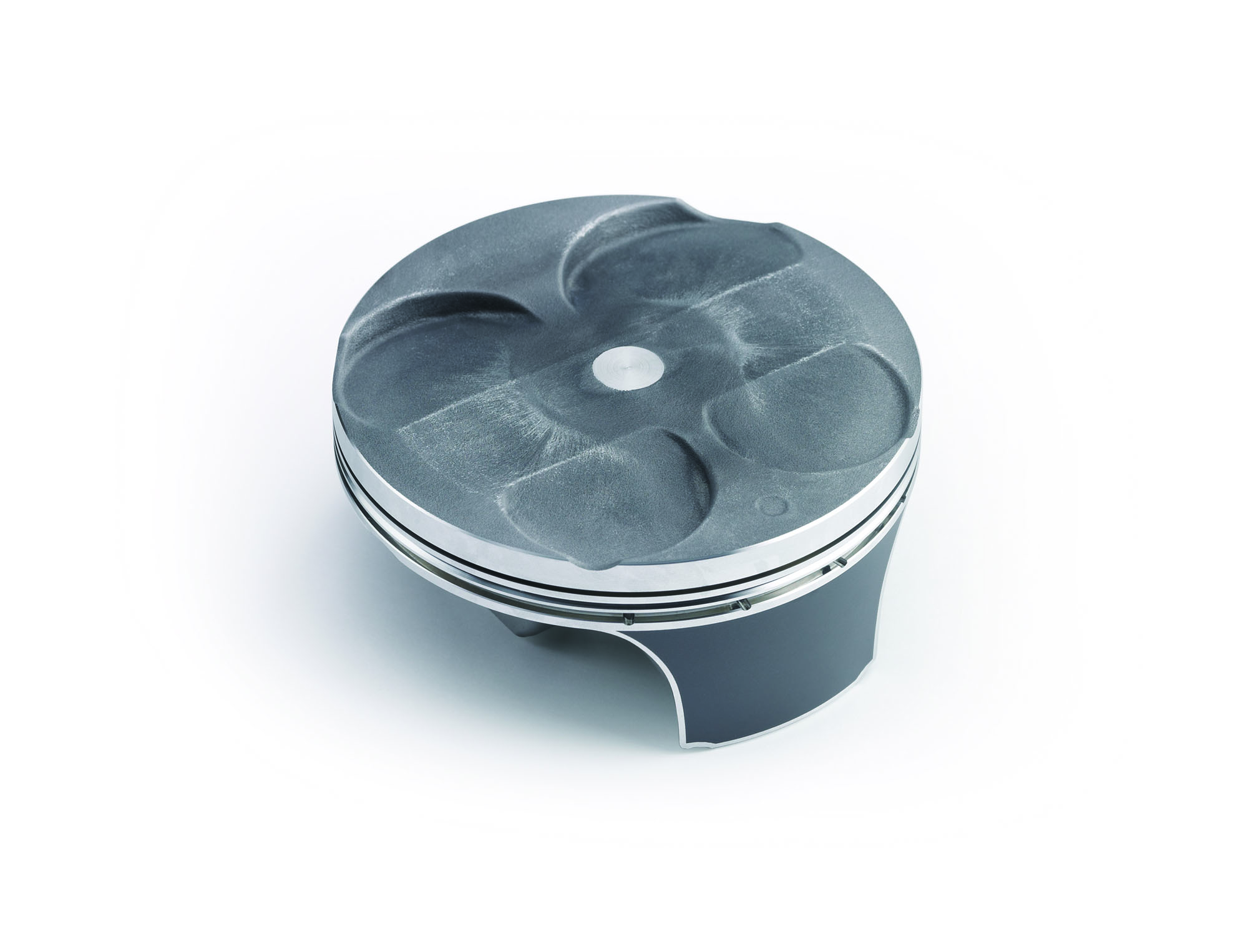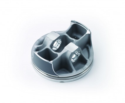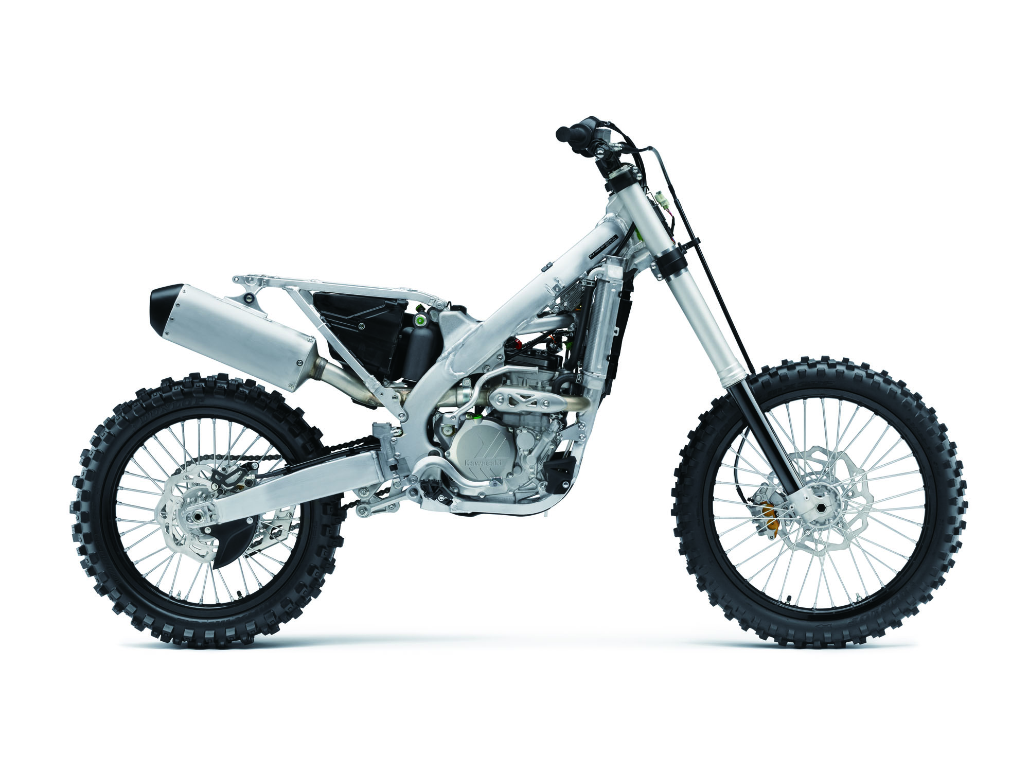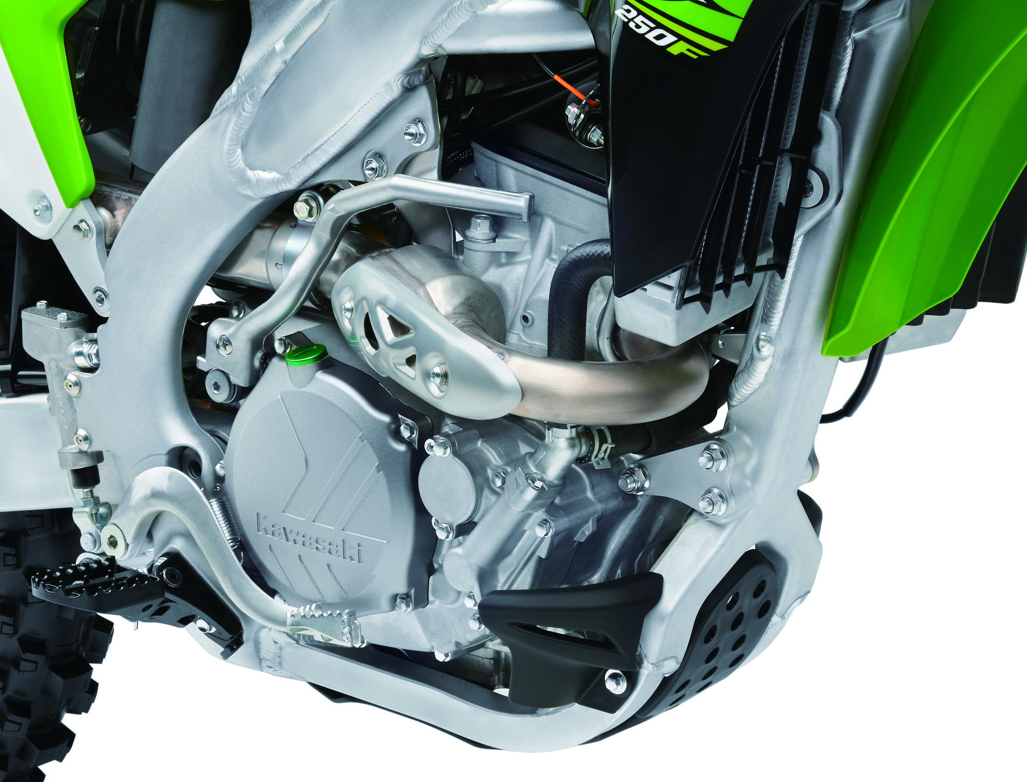 Kawasaki’s KX250F has a box type piston, which means these pistons have very short skirts, reducing weight and giving the motor the ability to rev out much quicker. The piston coating has been changed to molybdenum for increase wear resistance. Above the pistons are four titanium valves. Inlet valves are large 31mm items while exhaust valves are 25mm in diameter.