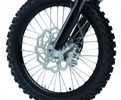 Shod with the new Dunlop S3 tyre, in the soft loam the tyre was faultless and inspired confidence whether on edge or holding it pinned. Braking is taken care of by Nissin brakes both front and rear. Front end braking is extremely powerful and has fantastic feel, you can easily brake to the apex of the corner with confidence and intimate control in modulation. Rear brakes do the job but I did have trouble with pedal height, especially mid corner. It is probably just a product of the way in which I ride but I prefer the rear brake pedal lower and then hardly any free play. You can’t achieve this with the standard set up.