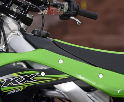 Jumping on the KX250F the very first thing you notice is the width of the radiator shrouds. They are very narrow and do not interfere in any way when moving around on the ultra flat seat. This gives a very small feel overall. From the fuel filler cap to the rear guard there is zero to get caught up on and transitioning from standing to getting all your weight over the front is slick.