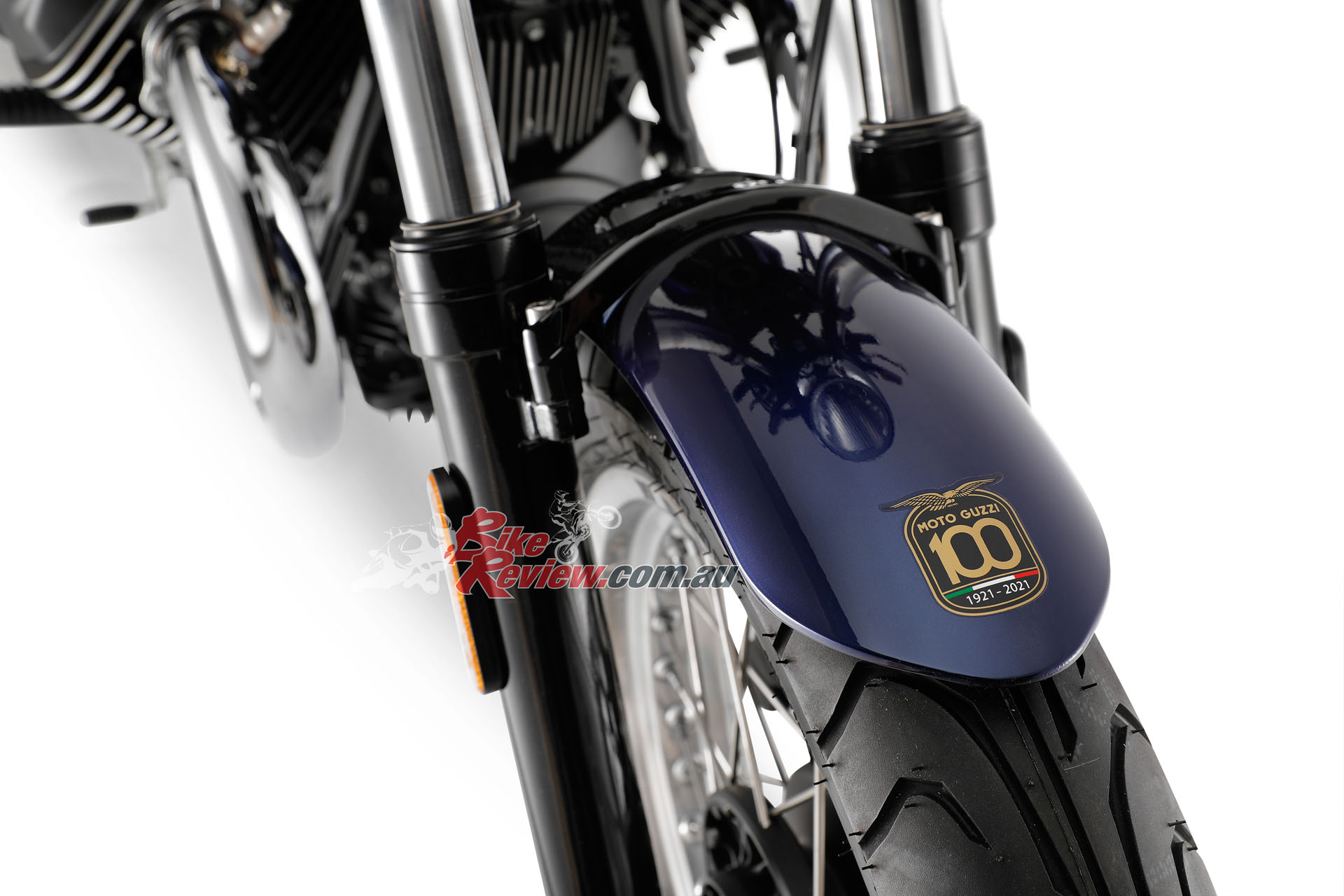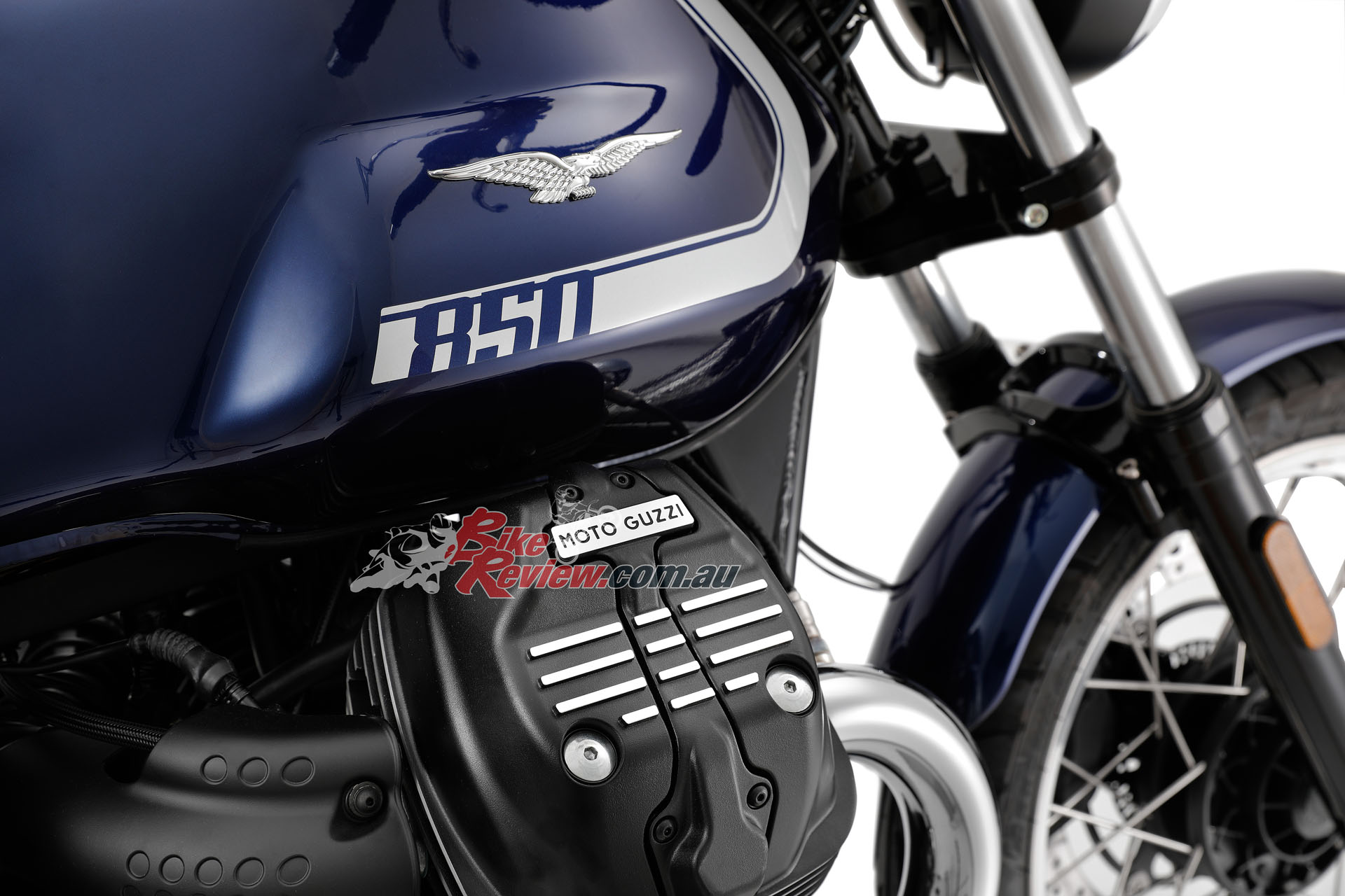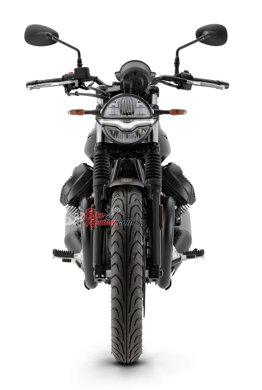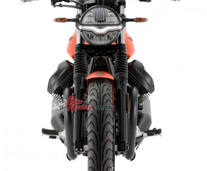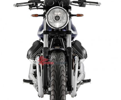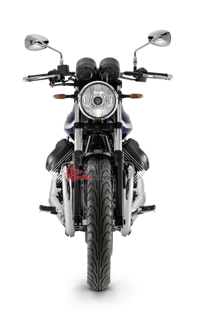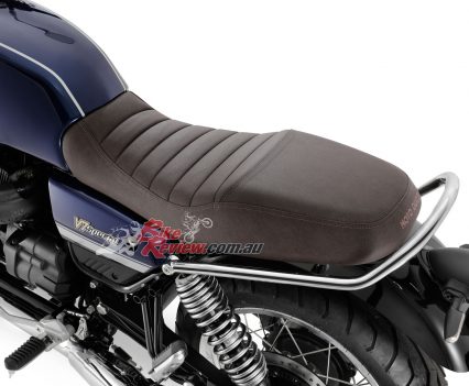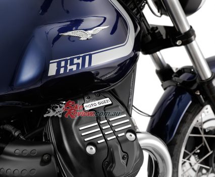 The side panels are new, as is the shorter rear mudguard, Moto Guzzi say these elements which, along with the new exhaust system, give the new ‘eight and a half’ a revamped and more seductive look. New features have been introduced to improve stability and comfort. The frame has been evolved with the addition of steel elements in the headstock area, whereas the new pair of shock absorbers with greater travel and the new, two-tier saddle ensure greater comfort.