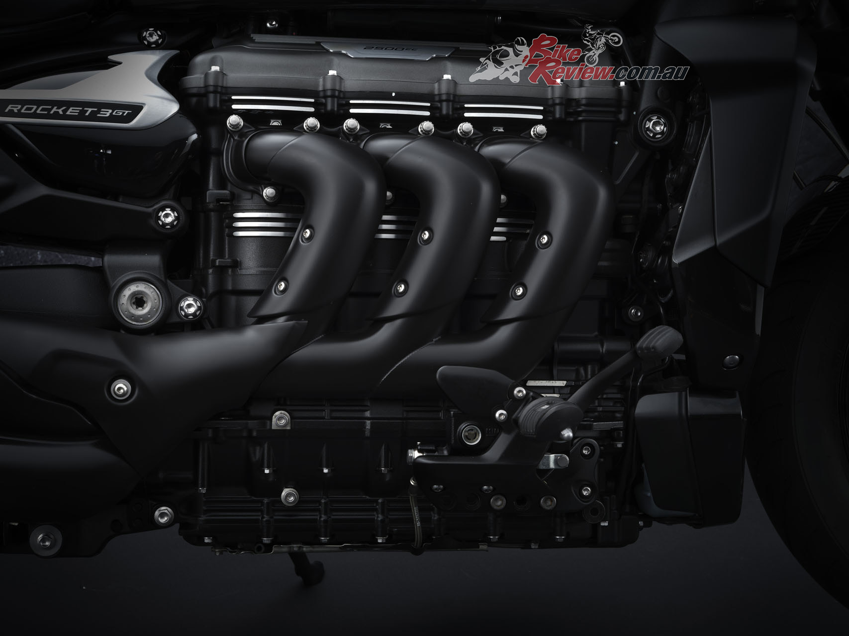 Engine: Liquid-cooled DOHC inline triple-cylinder, 2458cc, 110.2 x 85.9mm bore x stroke, 10.8:1 compression ratio, 3-into-1 headers with triple silencer.