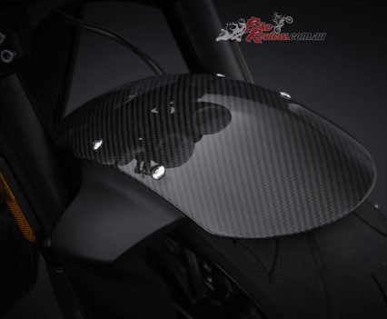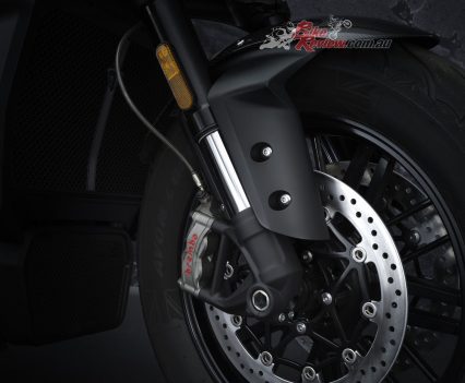 Brakes: Dual 320mm discs, Brembo M4.30 Stylema 4-piston radial monoblock calipers, Cornering ABS (F) Single 300mm disc, Brembo M4.32 4-piston monoblock caliper, Cornering ABS (R)