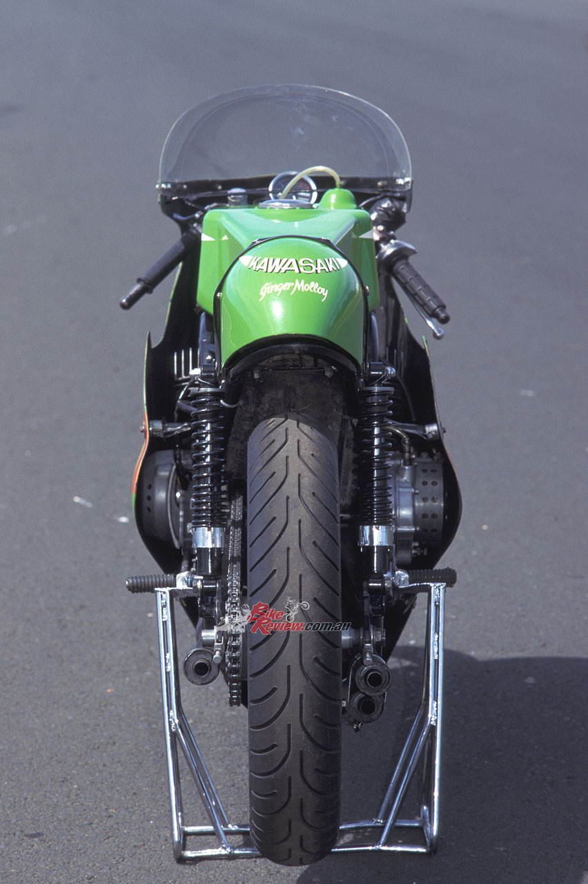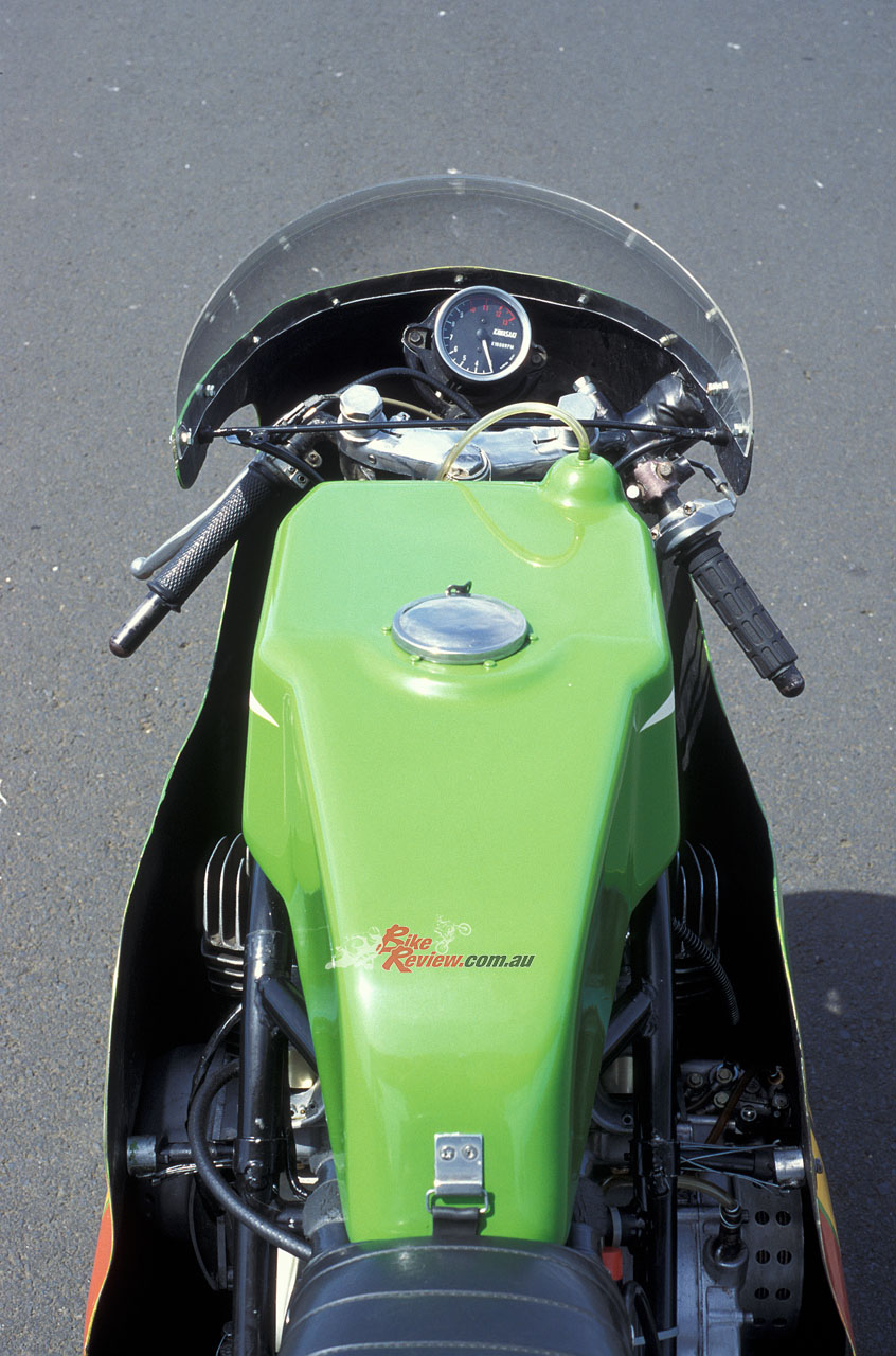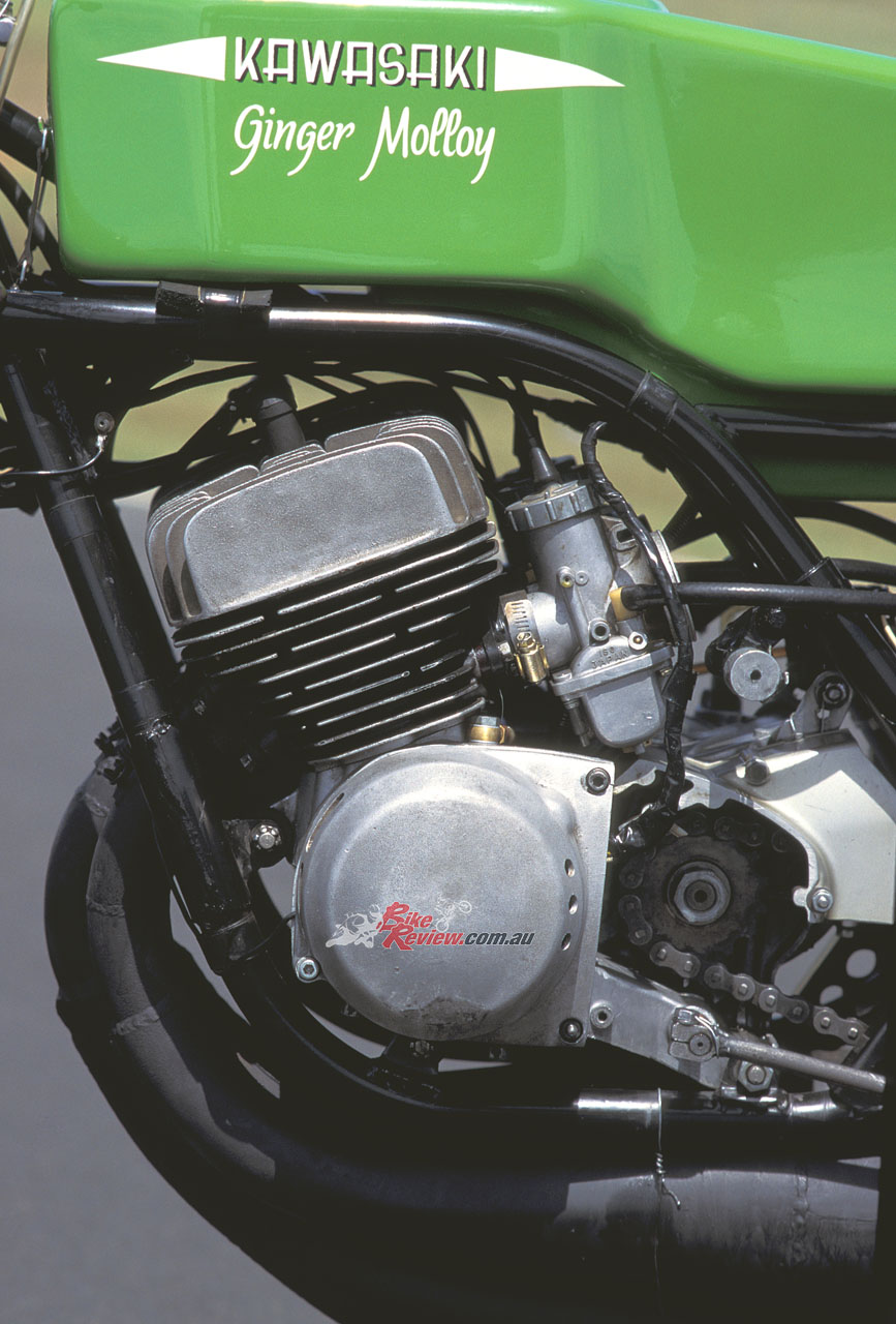 Forged two-ring pistons 20 grams lighter than the Mach III equivalents, with offset wristpins to reduce slap at either end of the piston stroke, were fitted to the 60 x 58.8mm engine. The five-speed close-ratio gearbox was matched to a dry clutch mounted behind the oil injectors, while the Mach III’s electronic ignition was replaced by a battery and three coils for the racer, complete with alternator – apparently Kawasaki technicians thought the CDI was too complicated for racers to understand!