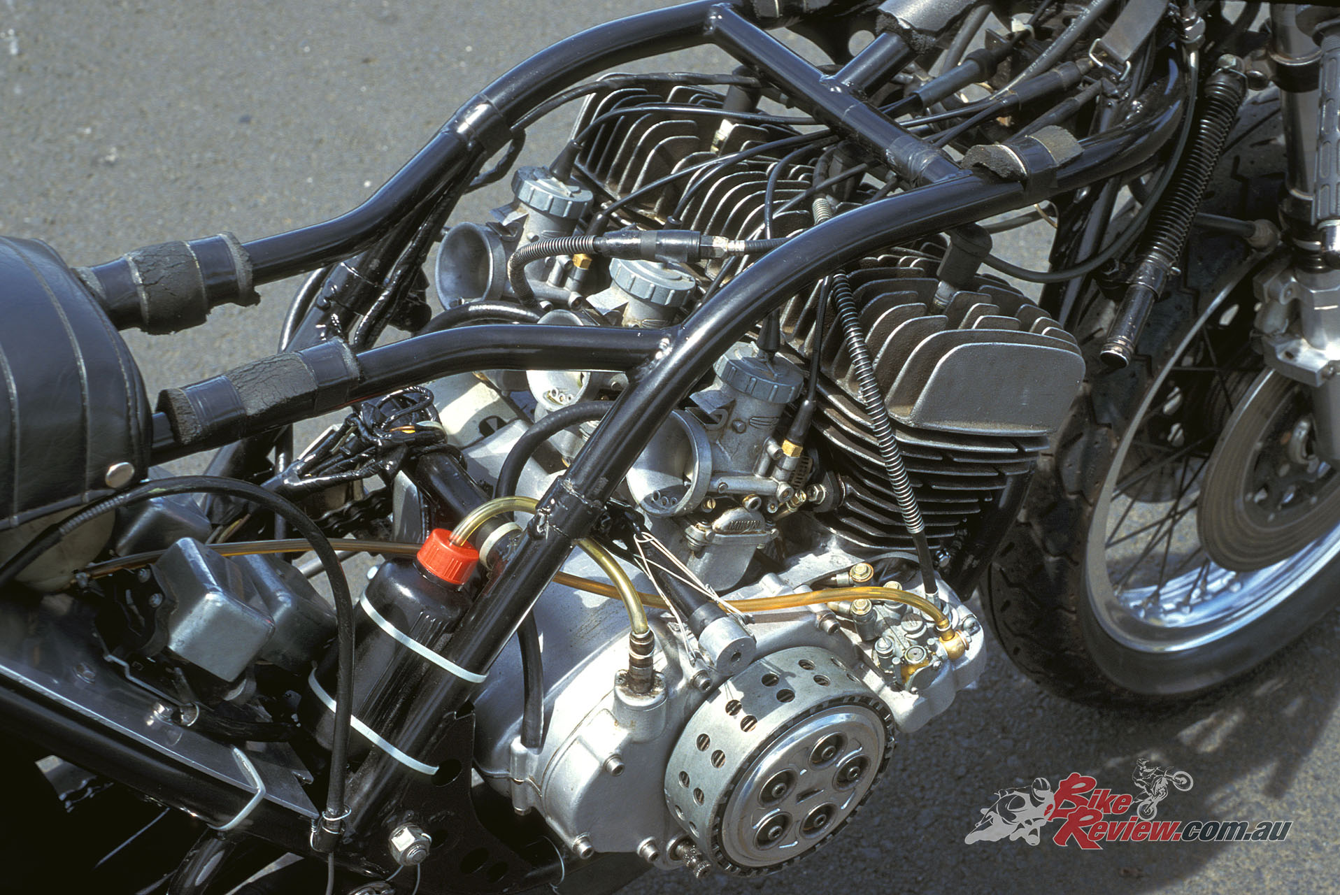 The Mach III’s electronic ignition was replaced by a battery and three coils for the racer, complete with alternator – apparently Kawasaki technicians thought the CDI was too complicated for racers to understand!