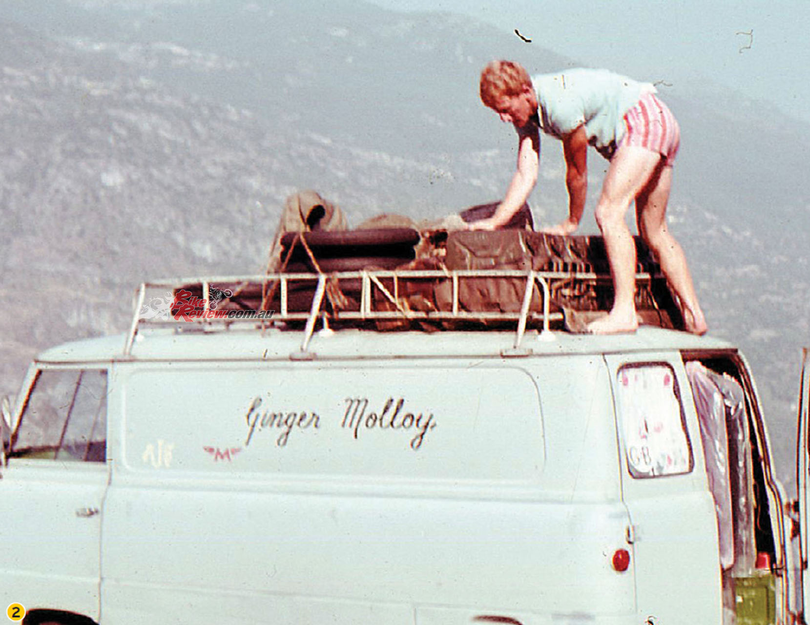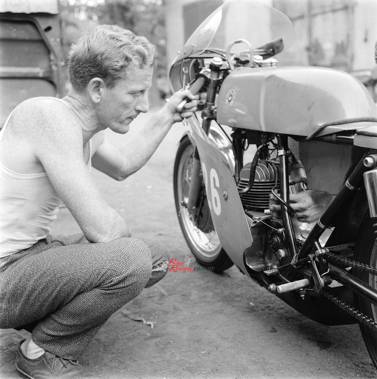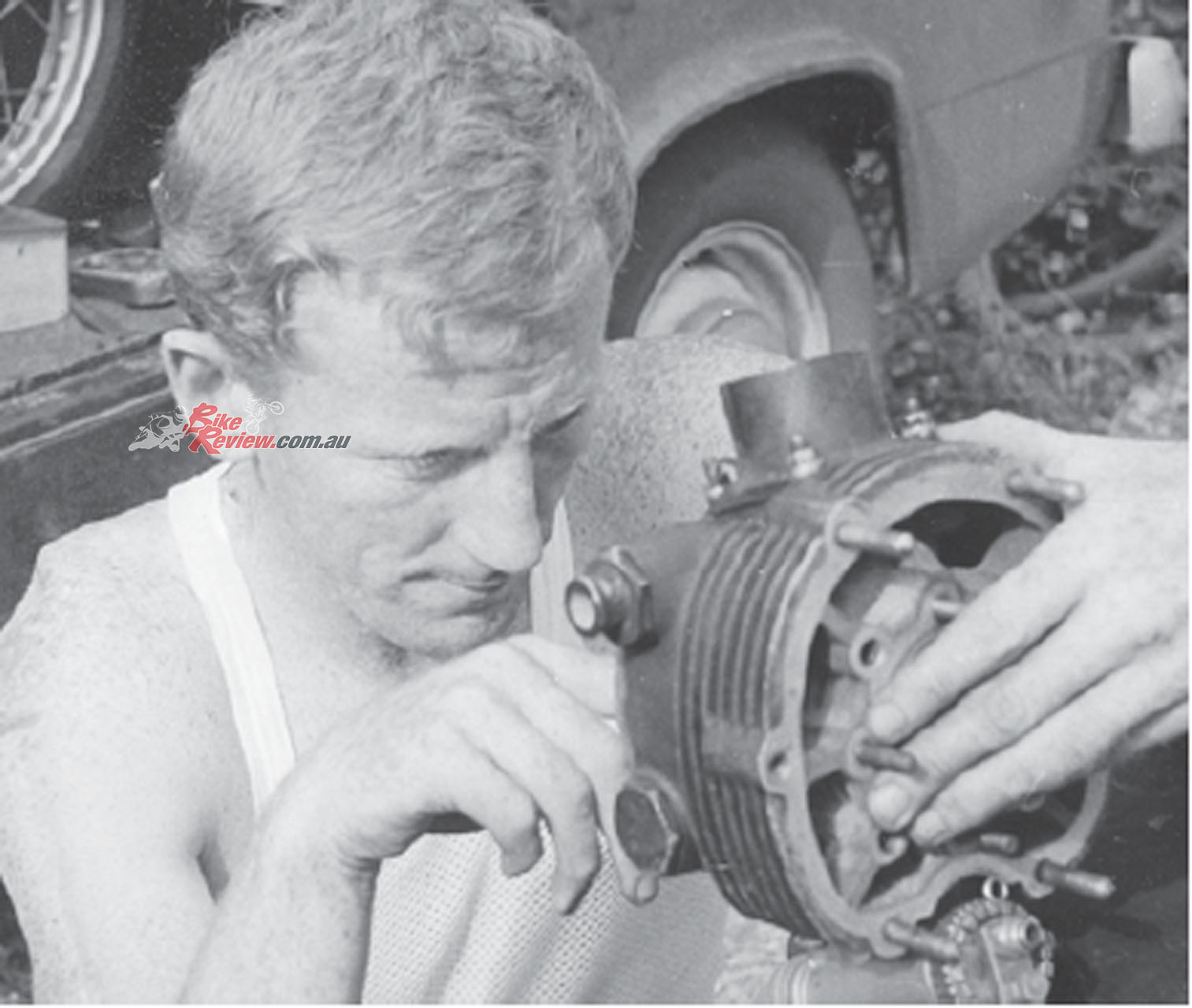 Ginger Molloy working on his Bultaco TSS cylinder. Back when you didn’t need to show up to a race weekend with a team transporter.