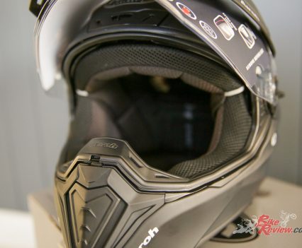 A peak for the off-road riding that was also removable for road riding. A full visor that seals the elements out and offers very good wide and clear vision with exceptional peripheral vision as well, the visor can also be removed if you want to run goggles when off road. There is also a simple to use sun visor that is easy to engage or retract and it offers very good sun protection to the eyes, far better than trying to jam a pair of sunglasses on.