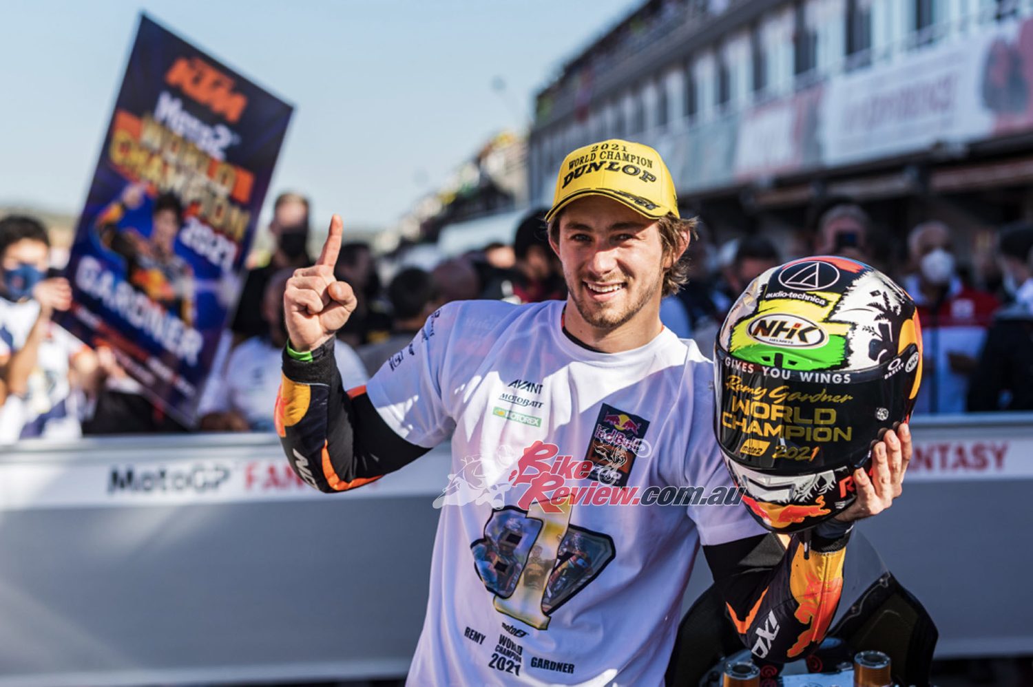 Gardner is the seventh Australian rider to clinch a GP world title along with Casey Stoner (2), Mick Doohan (5), Kel Carruthers (1), Tom Phillis (1), Keith Campbell (1) and Wayne Gardner (1). The Red Bull KTM Ajo team rider and his father Wayne, who won the 500cc World Championship in 1987, become only the second father and son to win World Championships, after Kenny Roberts Snr and Kenny Roberts Jnr.