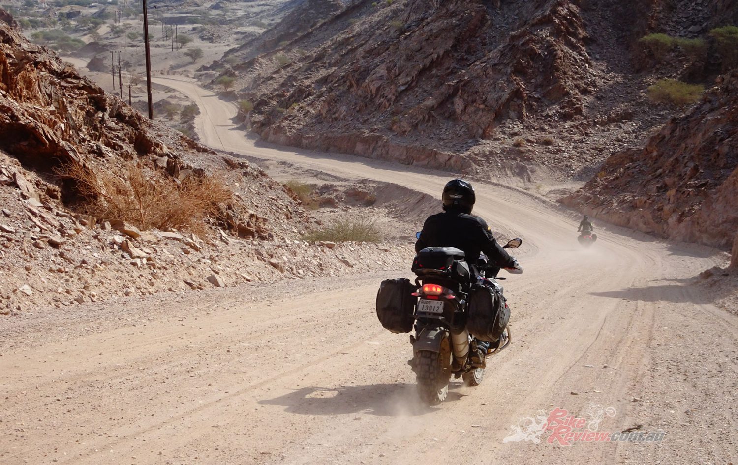 Later, we found the third amazing feature of the countryside and roads. Remember I mentioned all the power lines? Well, in Oman these run right over mountain ranges as well as through the valleys and across the flats. And of course they need access roads for maintenance! And of course these are not sealed. They are just dozer cuts in the scenery, which makes them hugely enjoyable on the kinds of bikes we were riding. There was one drawback, and that was the amount of dust lying around, but at least there was little or no sand.