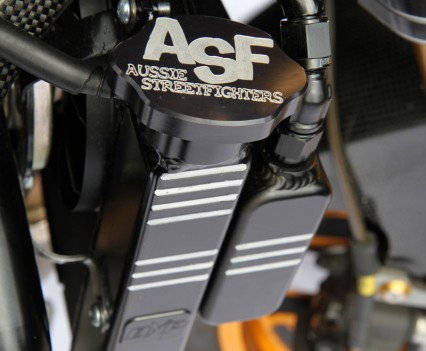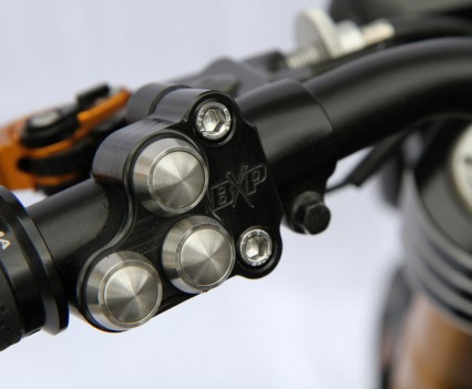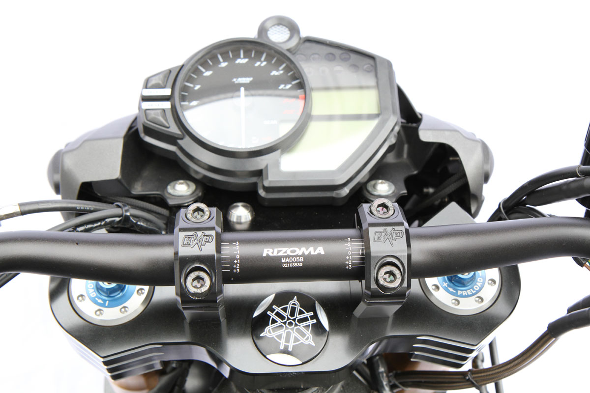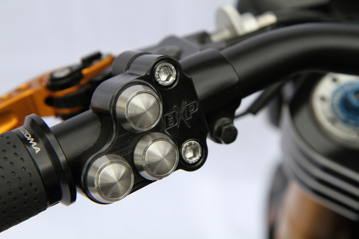 Custom BXP triple-clamps were made and anodised black with bare alloy pattern marks setting them off. Super chunky and menacing, the clamps are seriously tough.