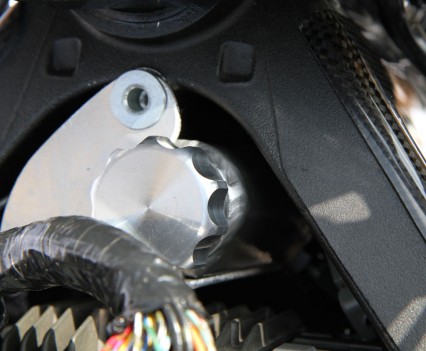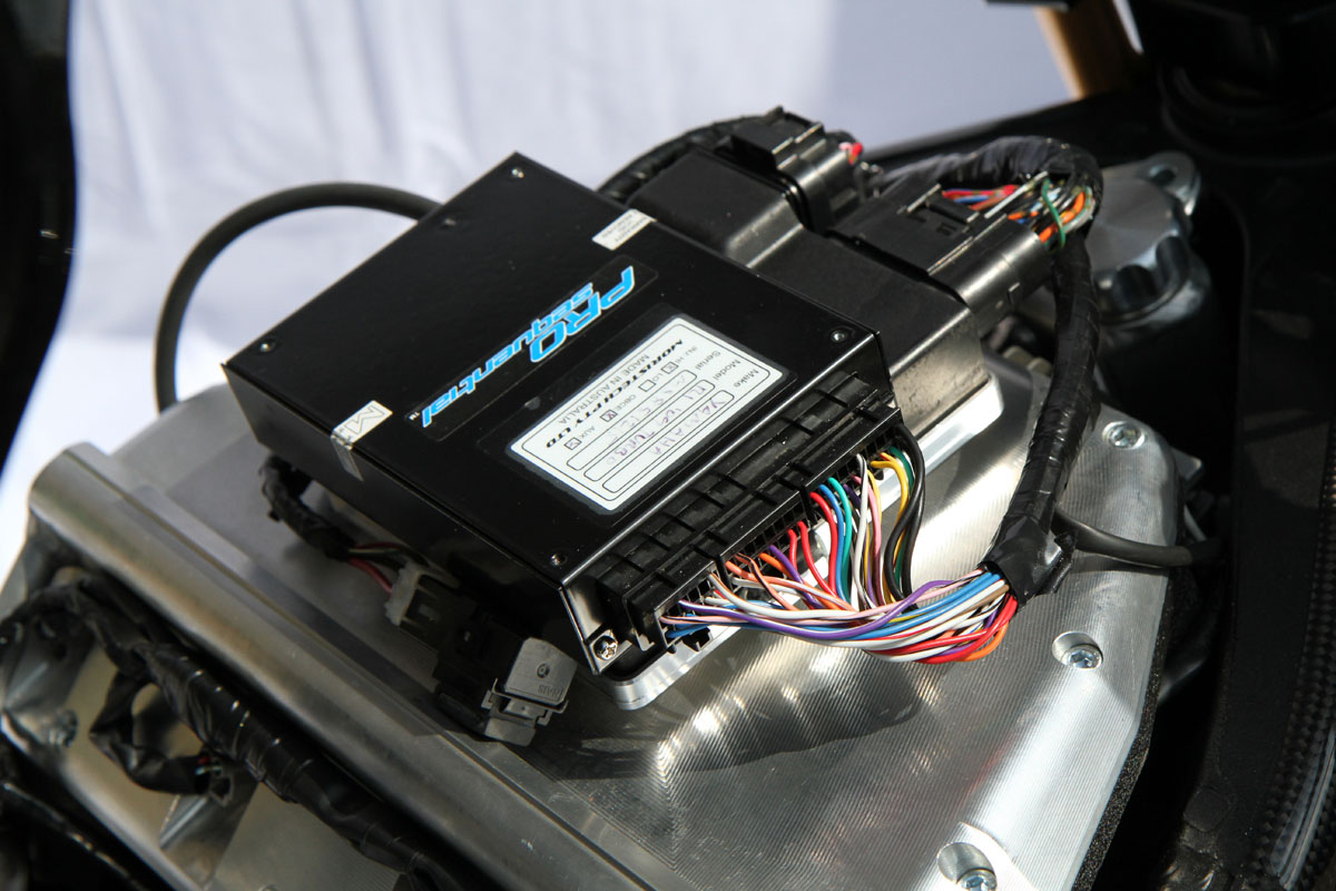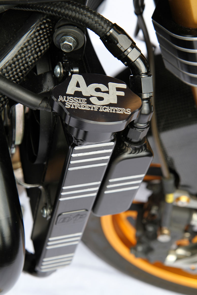 The gearbox is standard aside from a set of Hayabusa drag racing clutch springs. Final drive is by EK ZZZ 530 chain and BXP billet offset sprockets to accommodate the wide-arse set-up.