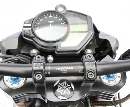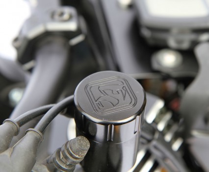 They pinch Ohlins FGRT800 43mm forks, four-piston radial-mount callipers, a Carrozziera forged alloy wheel, Galfer rotors and Hel lines. Rizoma ‘bars are bolted to the top and hanging off those are very, very trick BXP billet switchblocks, BXP reservoirs, Pazzo levers and Rizoma billet grips. The headlight comes form a Yamaha FZ1 and the dash is R1 with Motogadget back up.
