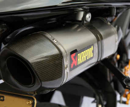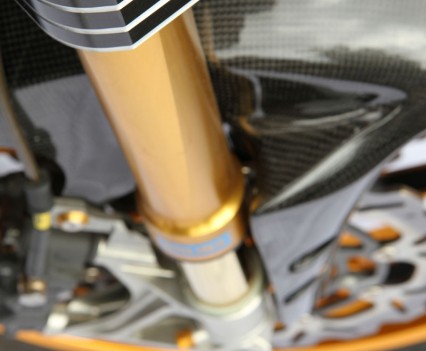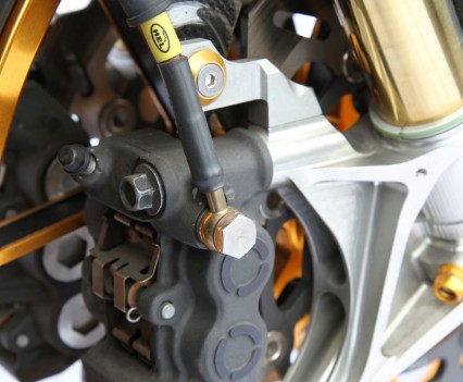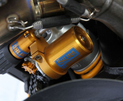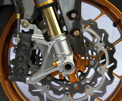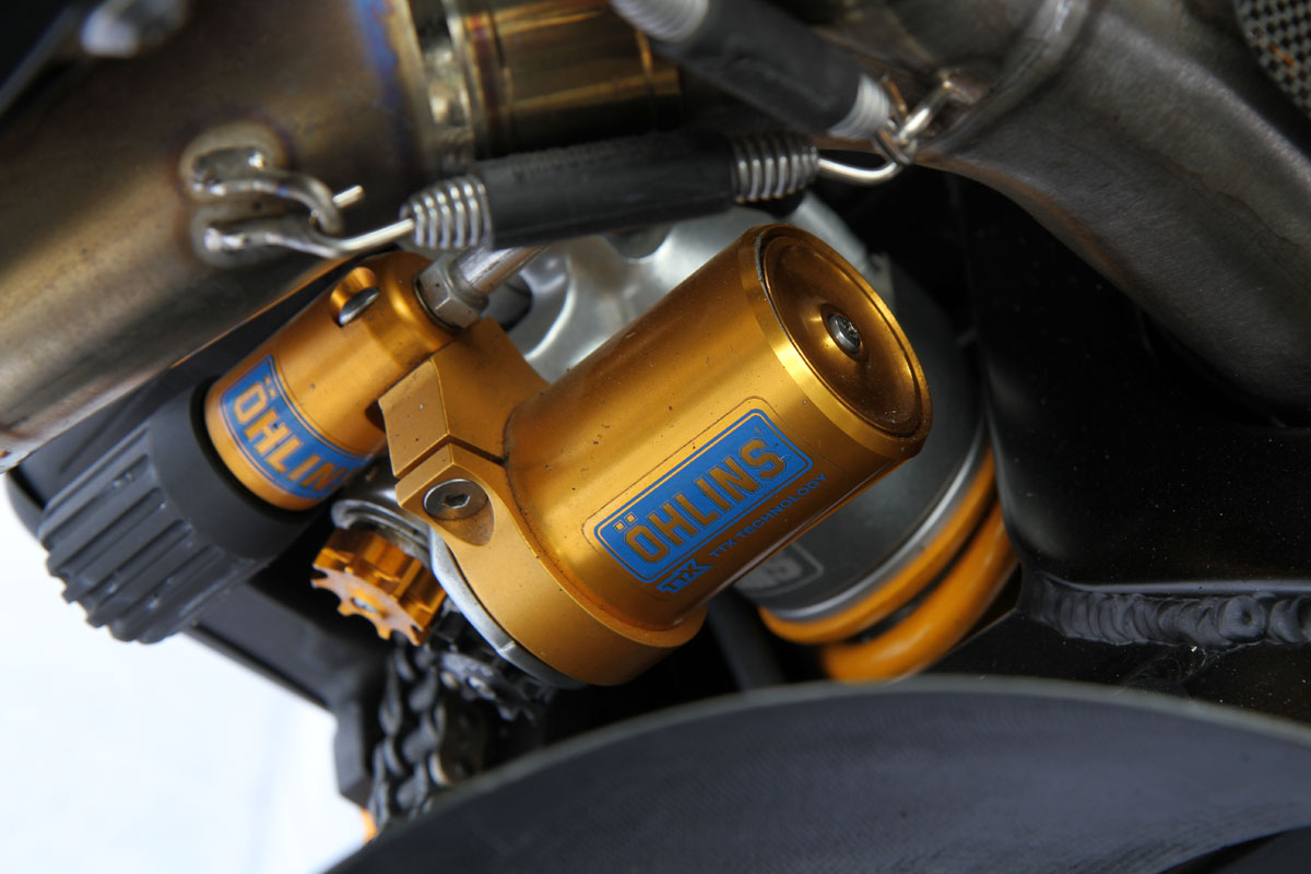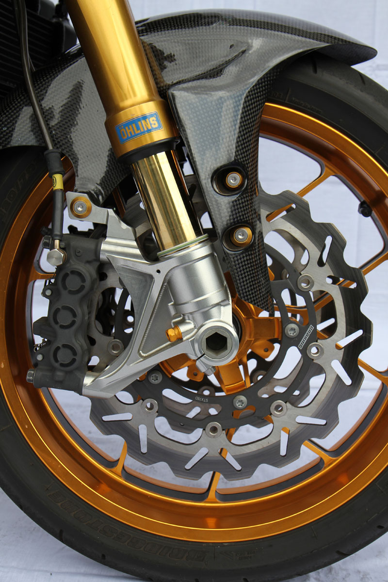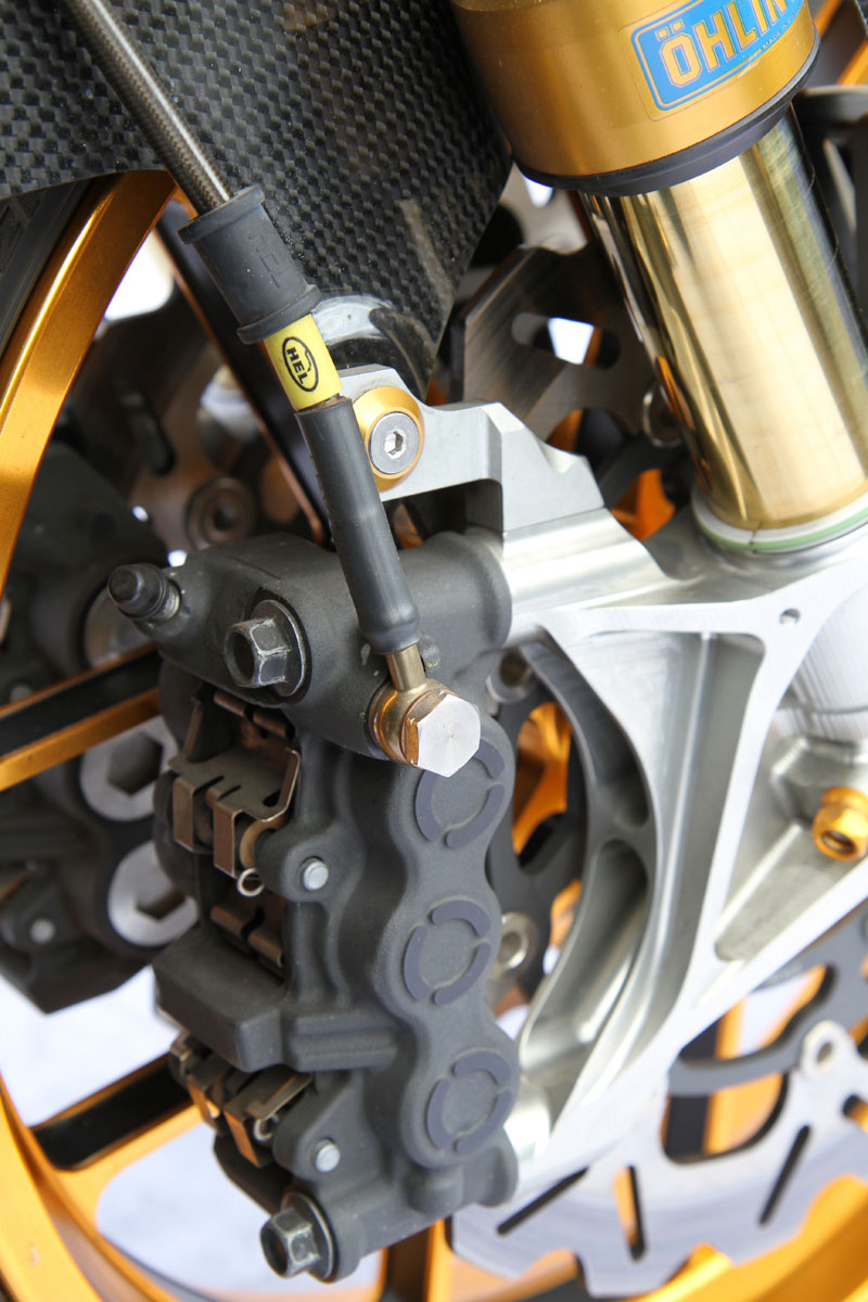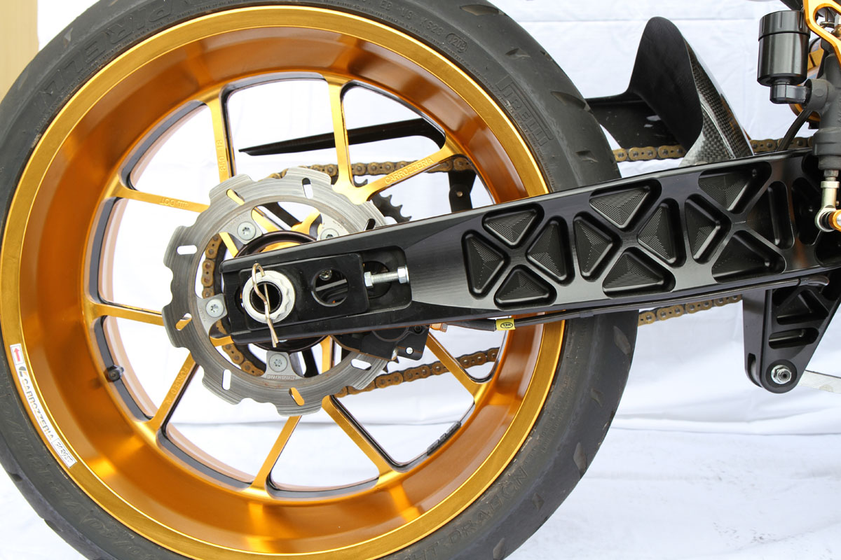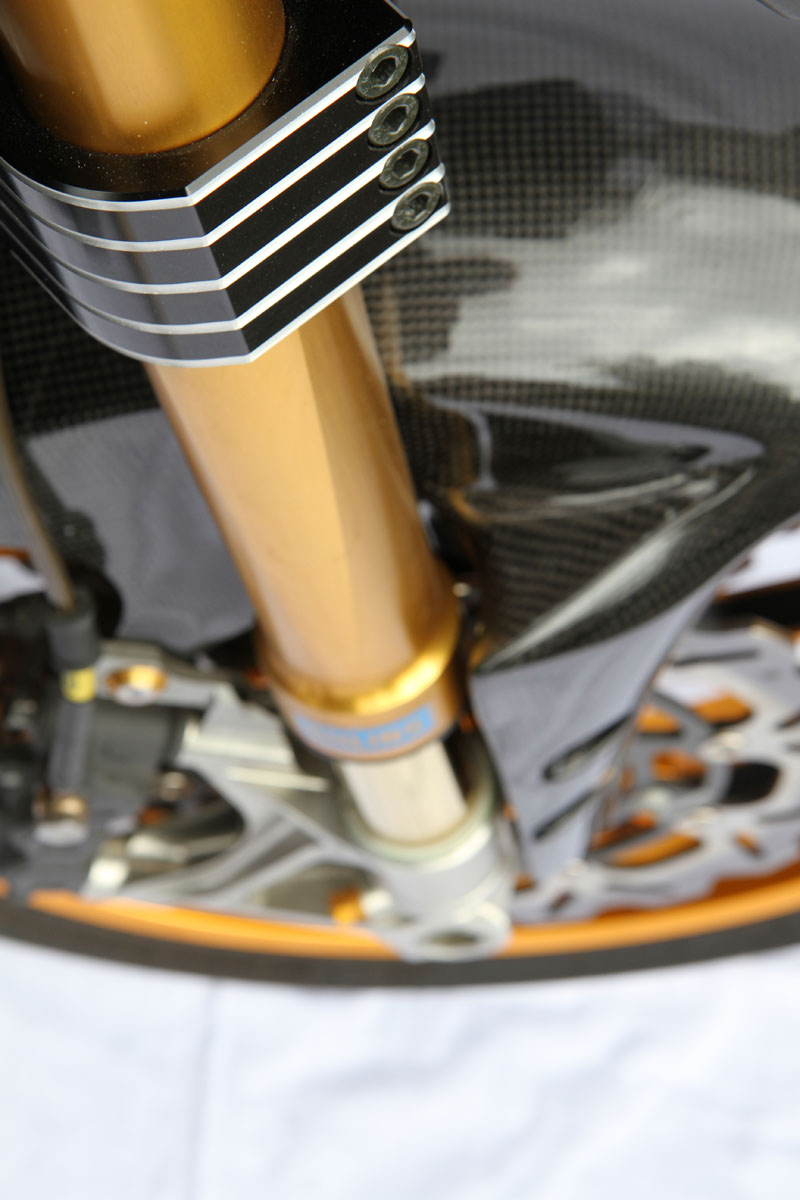 Heading south, an Ohlins TTX36 shock supports the sprung weight while the unsprung mass includes a stunning billet BXP CNC machined swingarm and a huge 8.5in Carrozziera billet alloy rear wheel with a massive 240-section Pirelli wrapped around it. Another BXP reservoir is fitted along with a mini billet caliper.