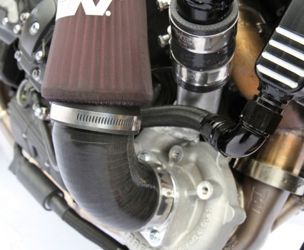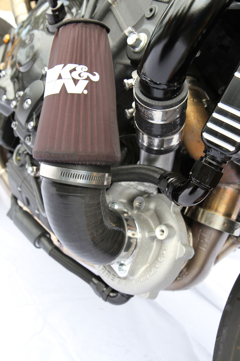 2009 YZF-R1 crossplane crankshaft engine. Liquid-cooled four-cylinder DOHC 16-valve four-stroke, 78 x 52.2mm bore x stroke, 998cc, 12.7:1 compression, eight injector EFI with YCC-T and YCC-I, six-speed constant mesh gearbox, slipper clutch, Akrapovic full system modified for turbo, modified R1 radiator with BXP billet end tanks and dual pass plumbing, second R1 radiator cut down and modified to make air/water intercooler, Brisk Racing spark plugs, Moristech piggyback fuel and ignition control unit, Turbosmart fuel pressure regulator, Deatsch fuel pump, custom BXP fuel rail, Garret GT2871 turbo, Tial stainless exhaust housing, Turbosmart Compgate 40 external wastegate, Extreme Creation headers, Turbosmart Kompact BOV, K&N filter, BXP billet plenum chamber with built in water/air intercooler and secondary injectors by Extreme, Hayabusa turbo clutch springs