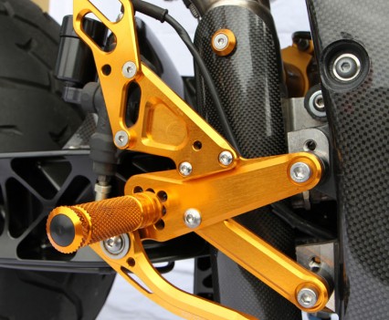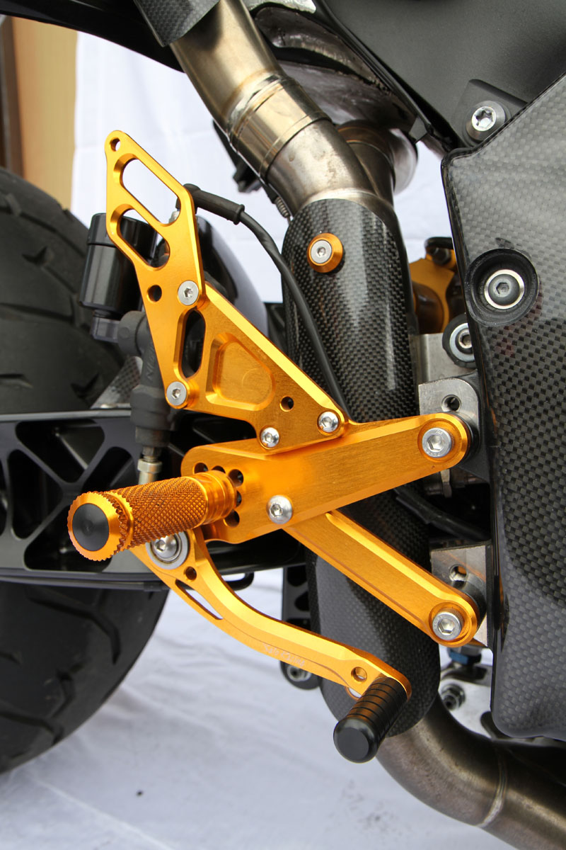 Sato rearsets hold Brock’s feet in place. Crazily enough – the bike still has pillion pegs!