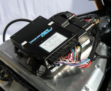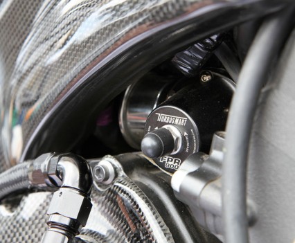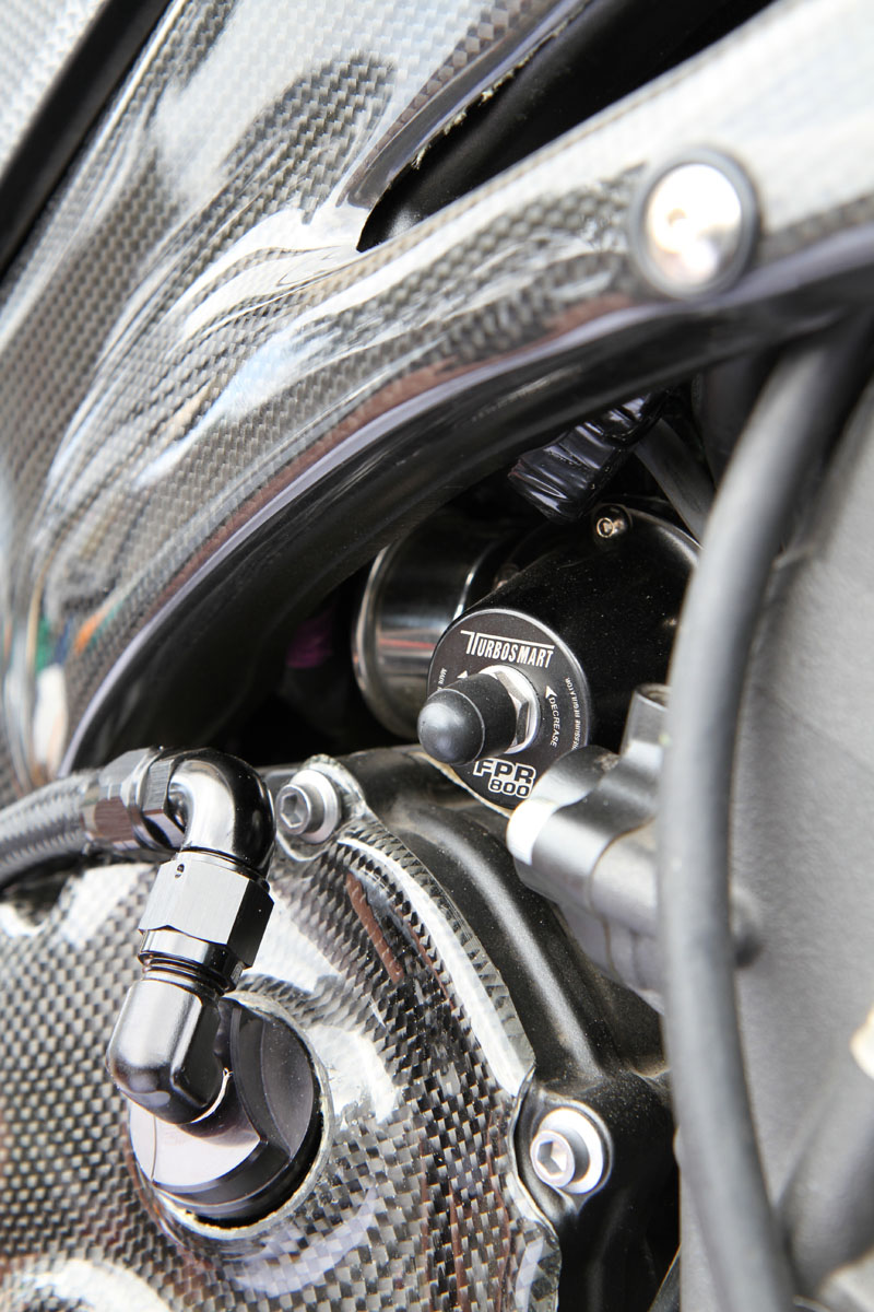 Keeping it all under control is a Moristech piggyback fuel and ignition control unit, Turbosmart fuel pressure regulator, Deatsch fuel pump and custom upper fuel rail feeding the original injectors and auxiliary injectors in the plenum chamber. Brisk racing plugs fire the mix and the stock throttle-bodies are retained.