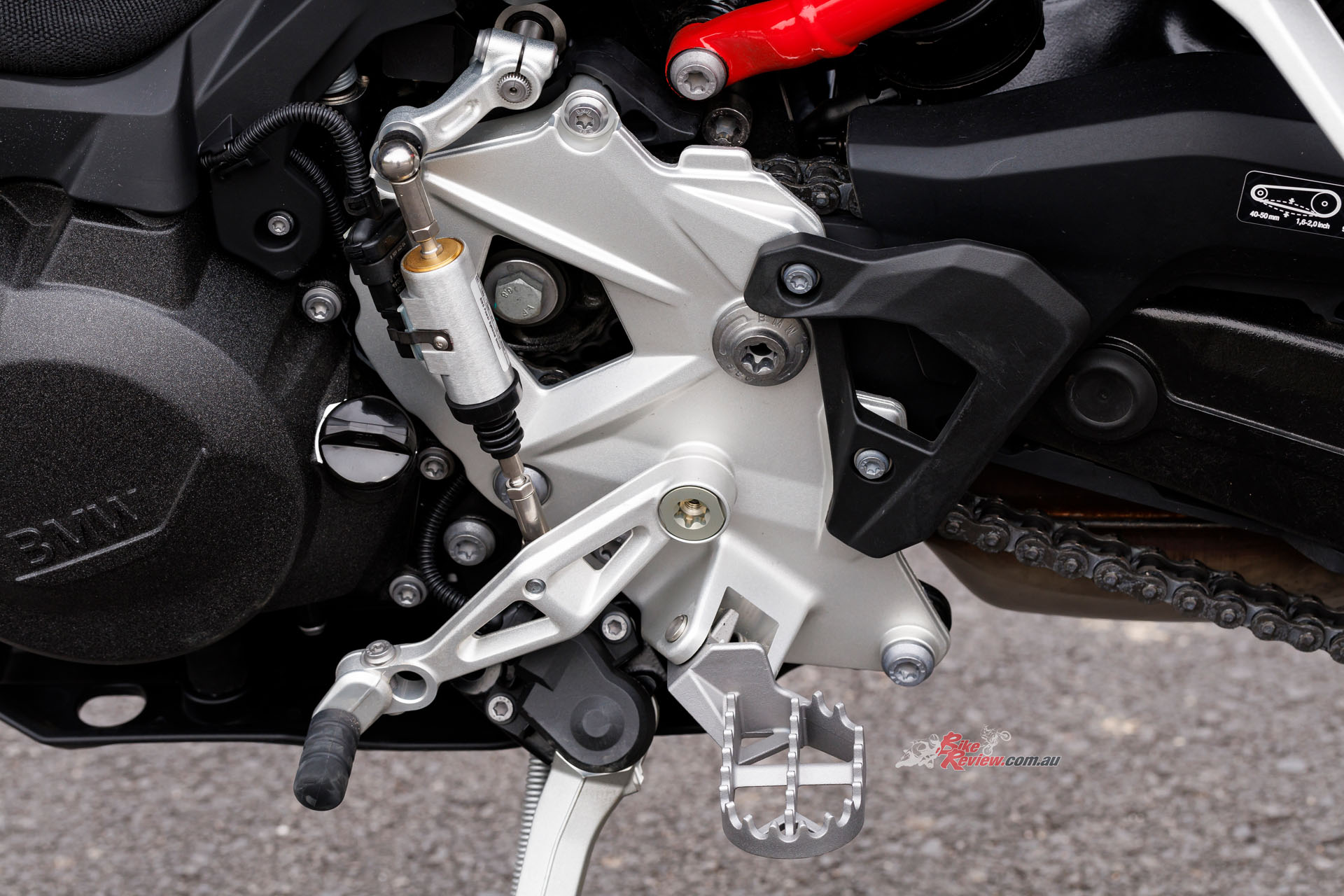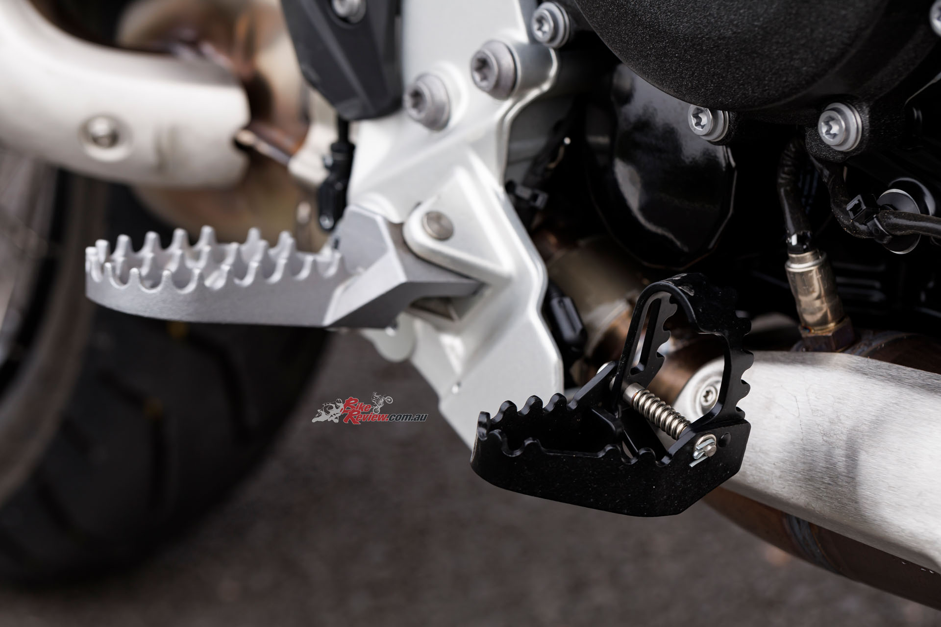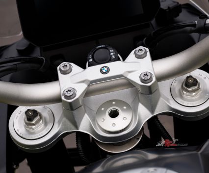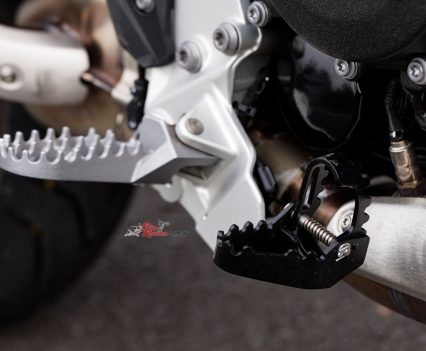 The handlebar position is higher than the more-relaxed 850 GS, with a taller, flatter, motocross-style ‘bar while the gear shift has an eccentric adjuster to alter its height without fiddling on lever position. The brake lever has a throw-down riser to quickly and easily change its height as conditions change.