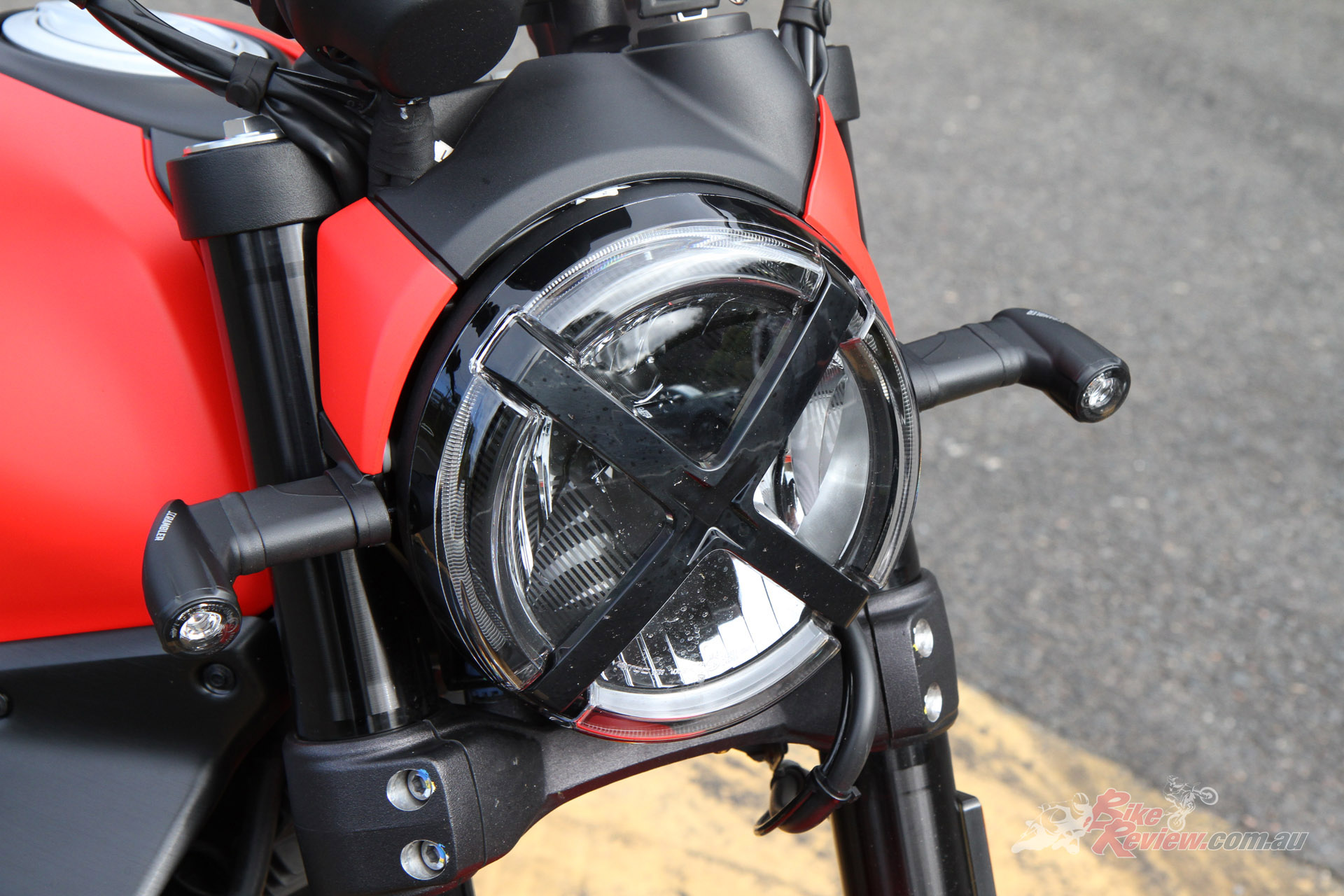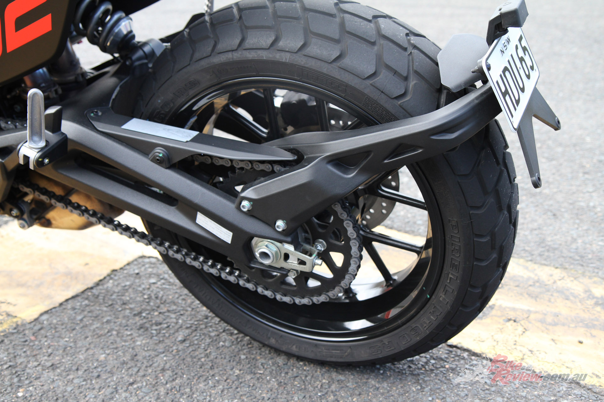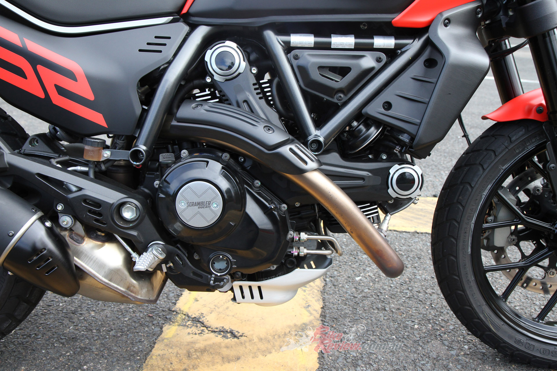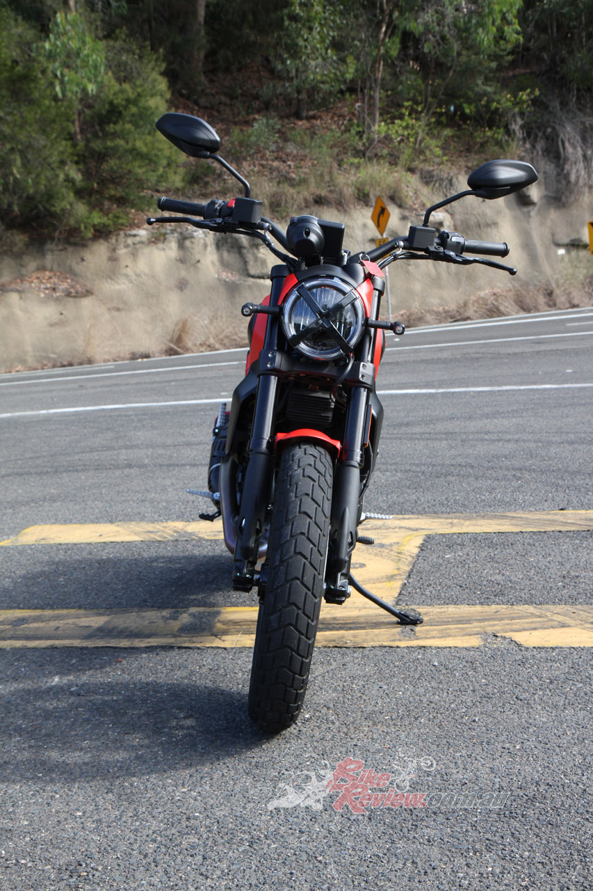 The general ride is more than easy – the seat is surprisingly low (there are three seat options, which is very considerate) and the balance is plenty feelable through the feet-bar-bum triangle. Testing the hand levers, the clutch is light and the brakes squeeze to a nice tactile degree before feeling locked. Under you is about 180kg of alloys and fluids, which is darn light in and amongst the cohorts of this pseudo-class of motorcycle. Is it an actual scrambler, though? I’m not exactly sure – the tyres and sump bash-plate allude to off-road prowess, but perhaps not so much with the road-travel front and rear suspension, the tiny front guard that lives dangerously close to the front rubber for anything but loose sand, and limited multi-purpose tyres.