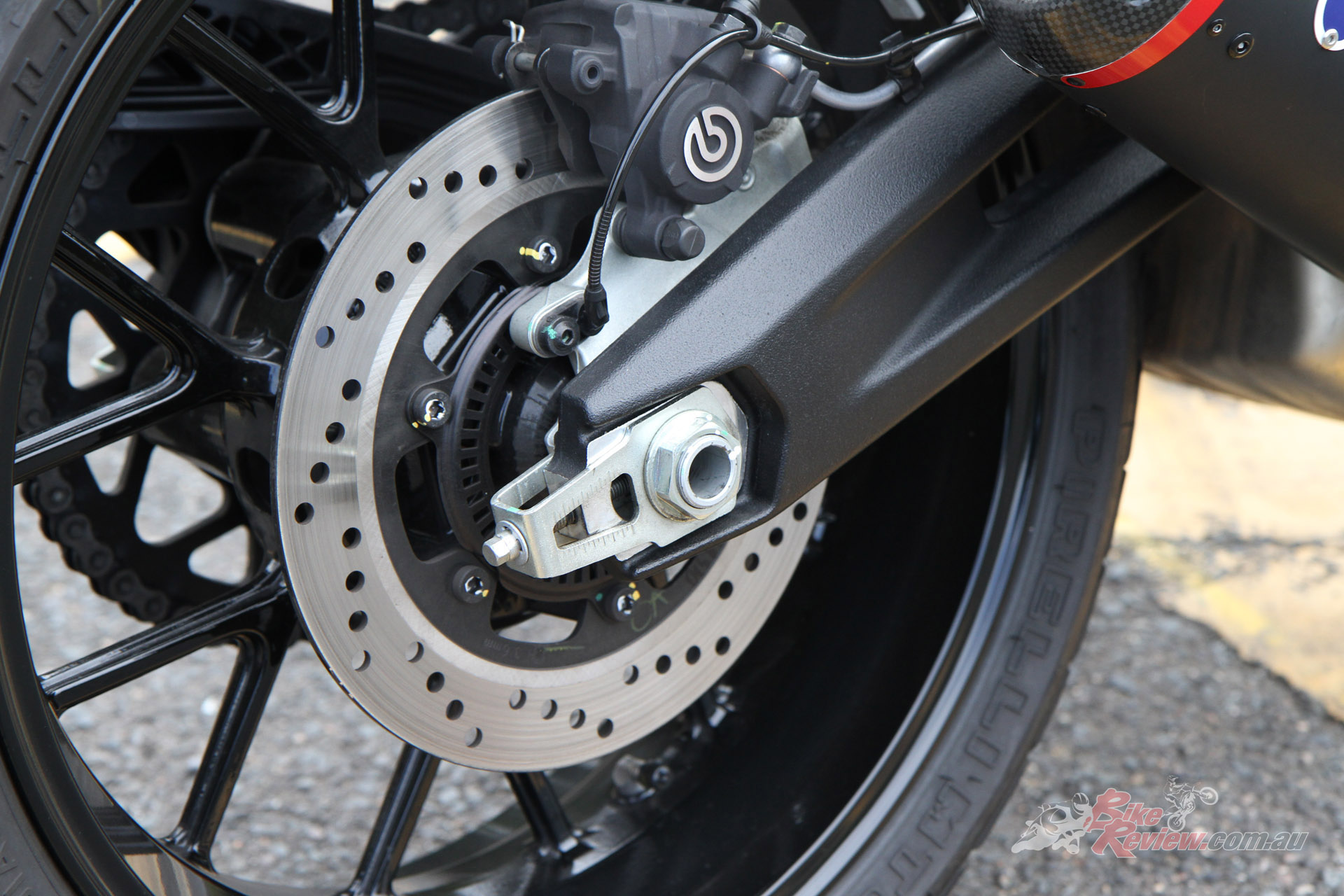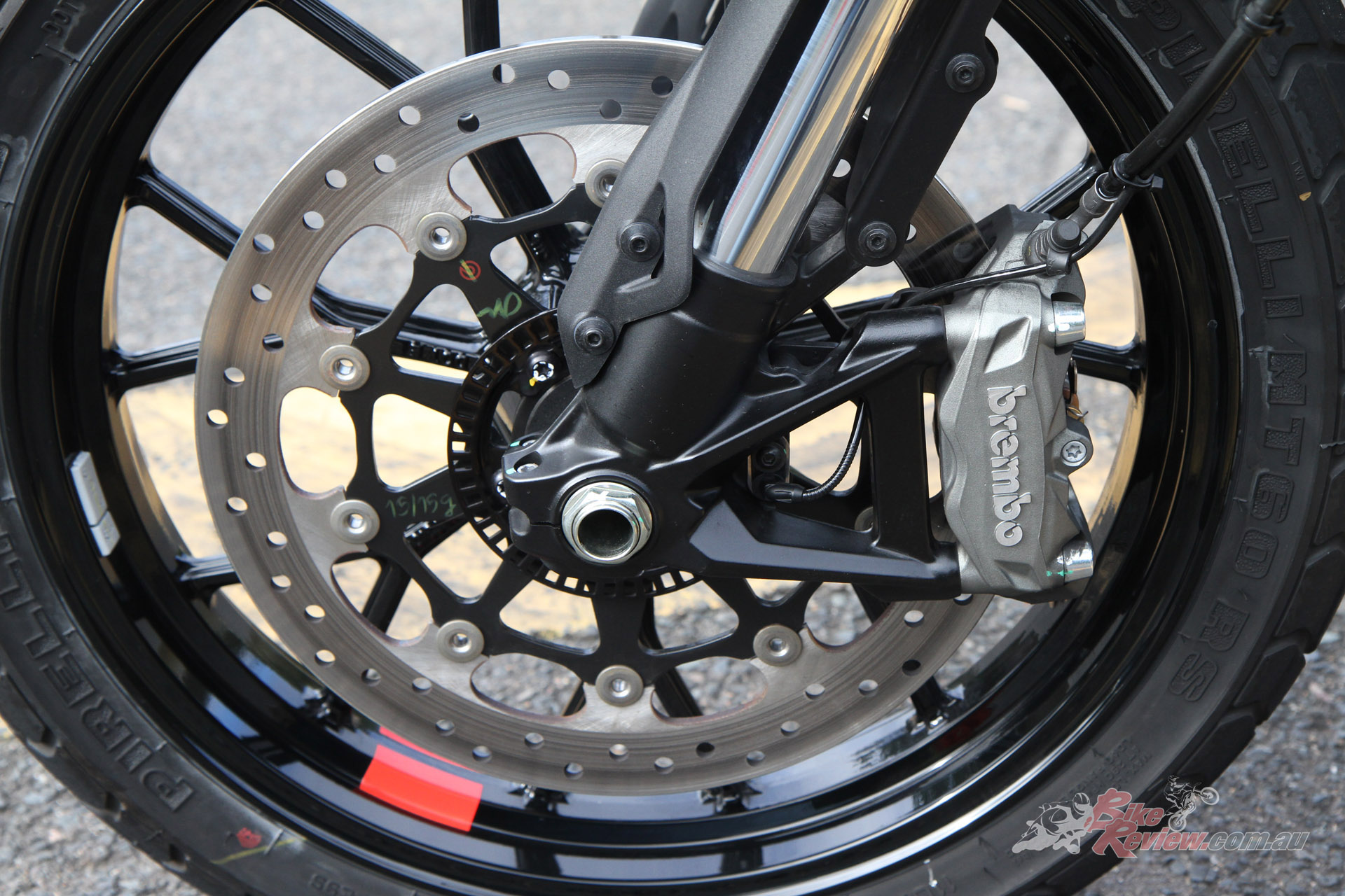 Brakes: Bosch Cornering ABS, 330mm semi-floating front rotor, radial Brembo Monobloc four-piston caliper, conventional master-cylinder, 245mm rear rotor, single-piston caliper.