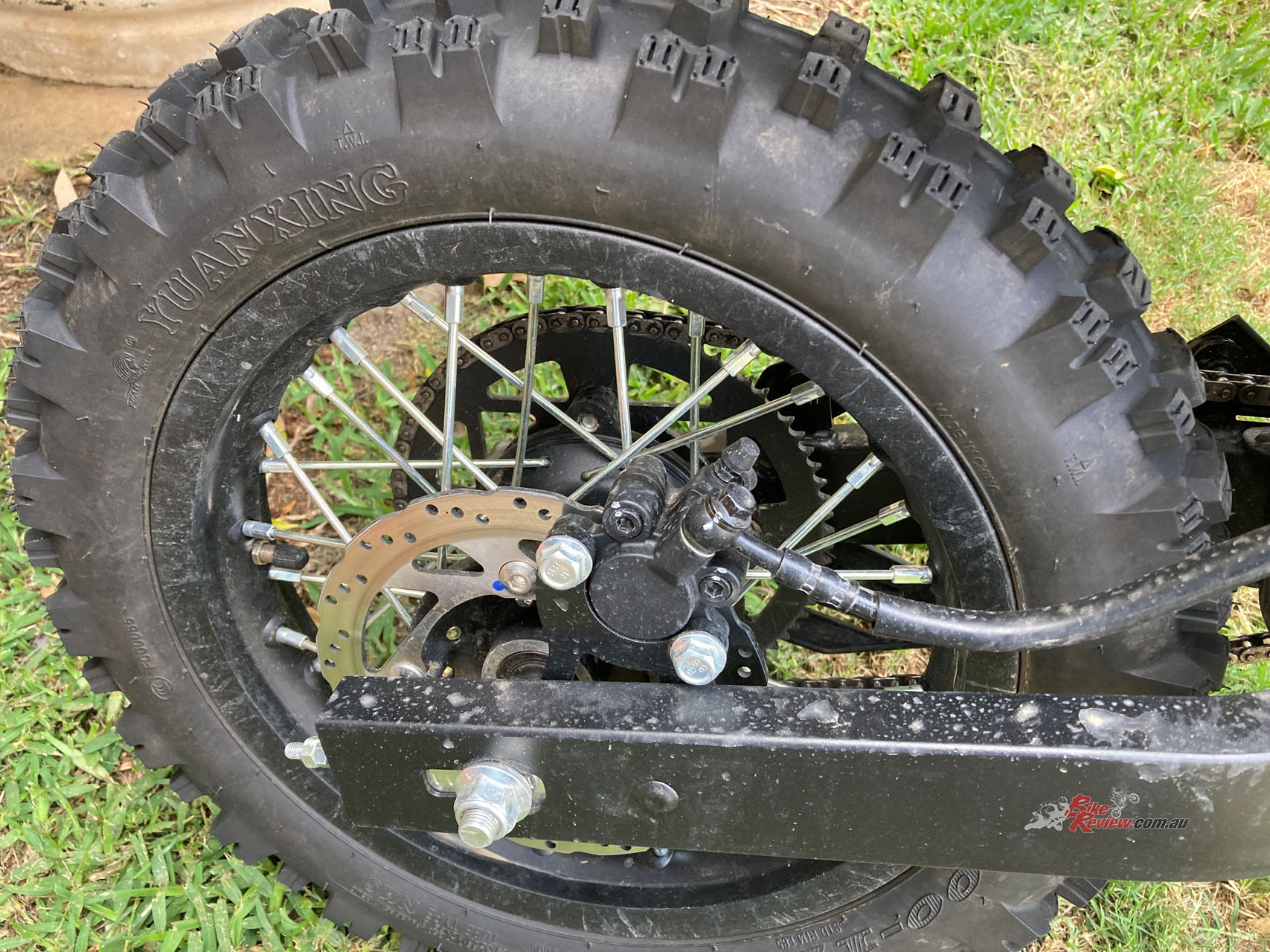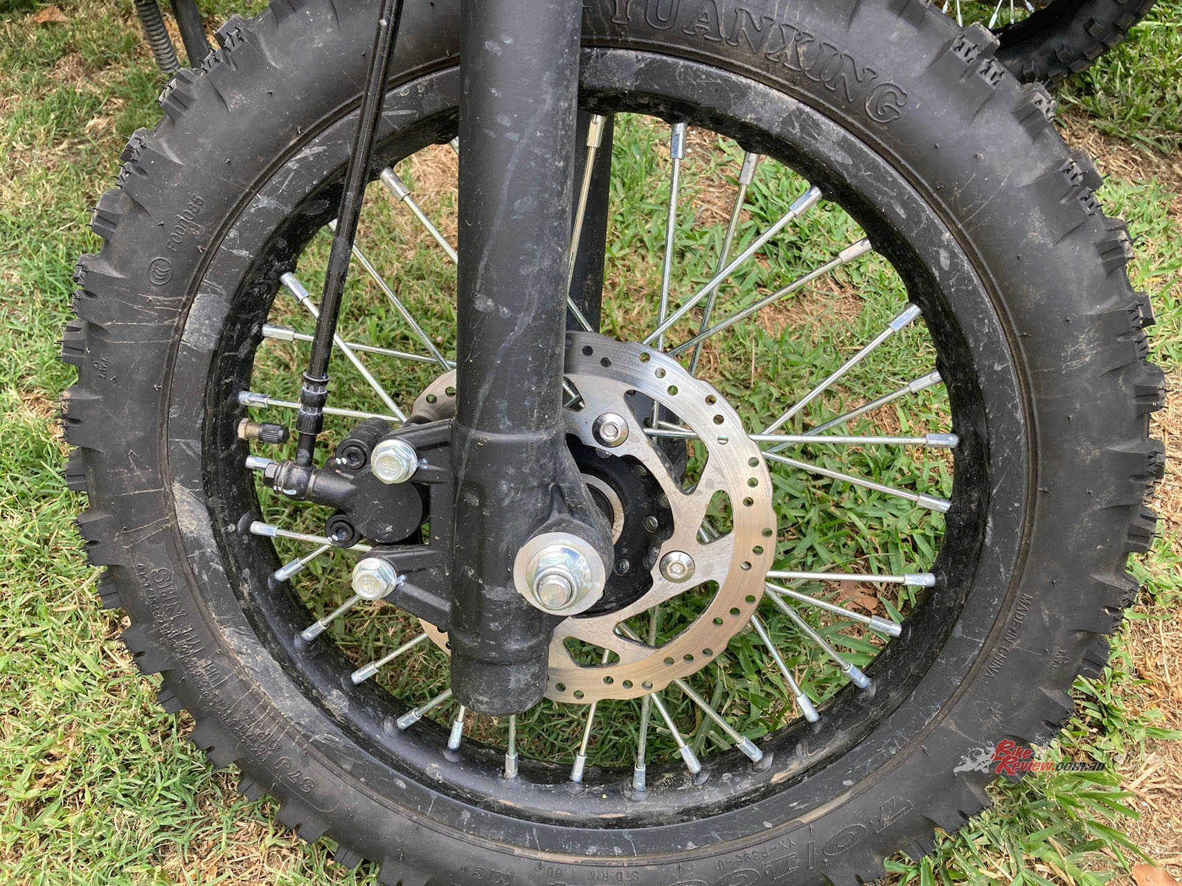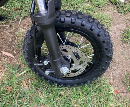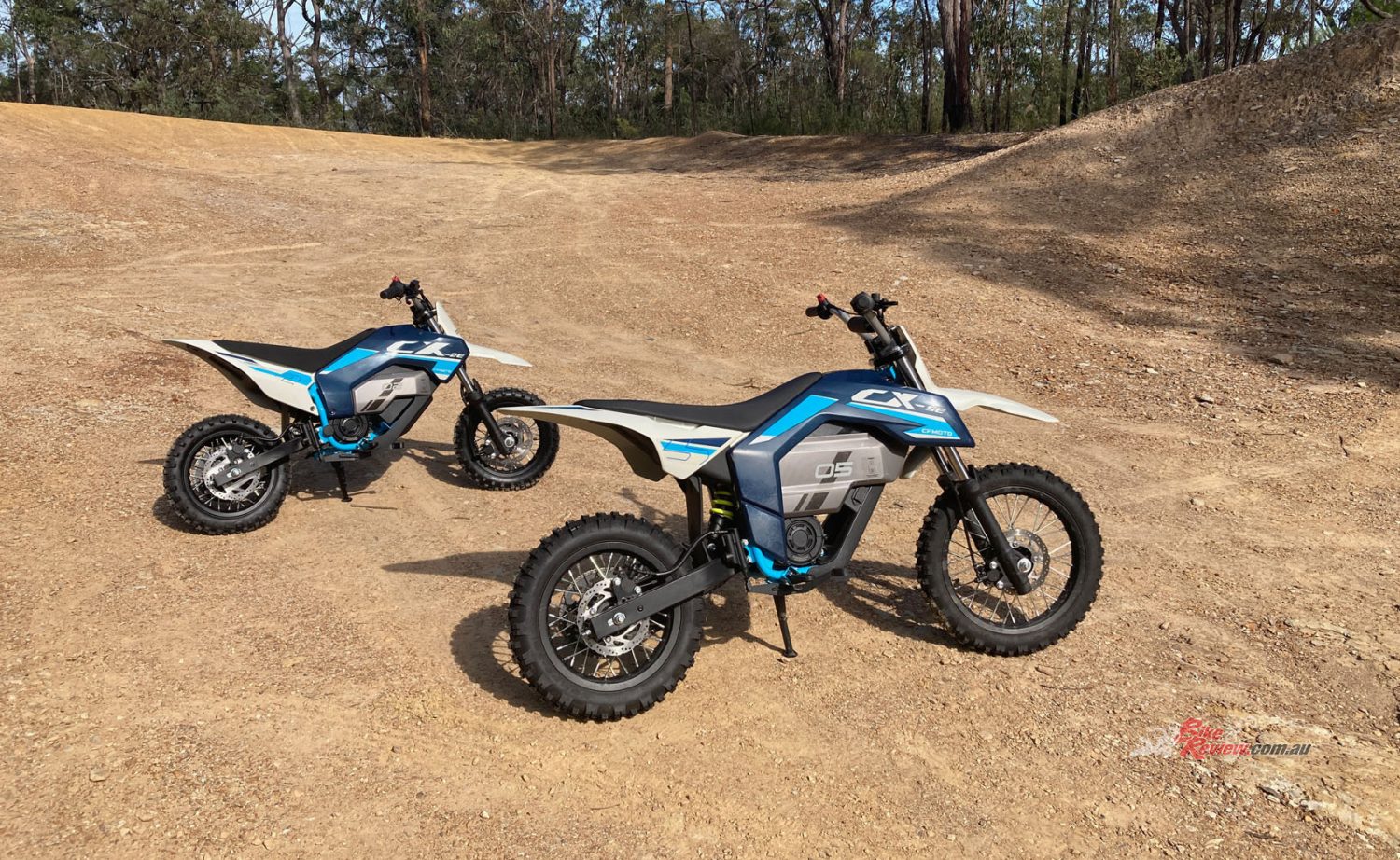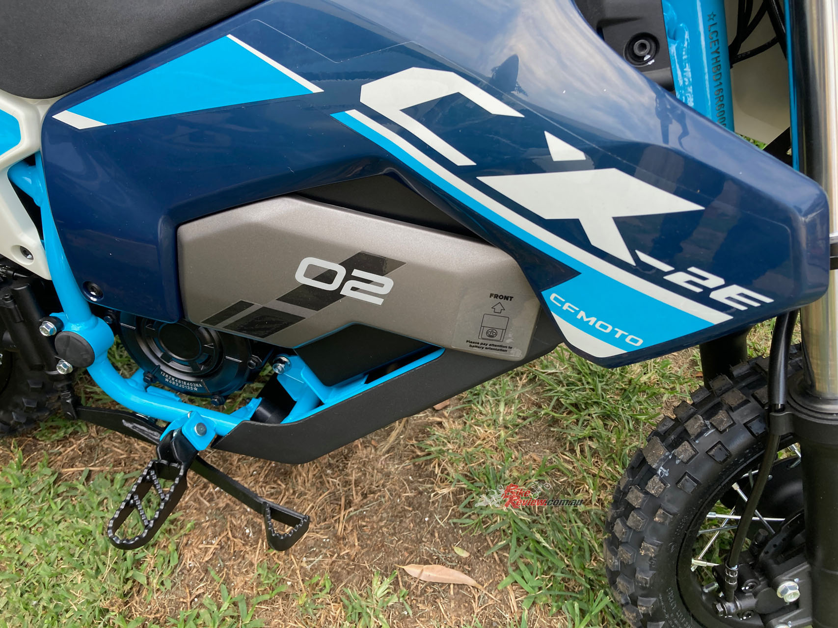 Let’s take a quick look at the specifications of the two bikes, bearing in mind these are fun bikes, not competition bikes, so we can’t expect big performance numbers or top spec running gear. These bikes are designed to be reliable, easy to maintain and run, affordable and fun. The CX-2E is the starter bike, slightly bigger than a PW50, smaller than a KTM50SX Mini, it runs on 10in wheels, has a seat height of 550mm and weighs just 49kg. The CX-2E is 1330mm long, and has a top speed of 36km/h.