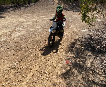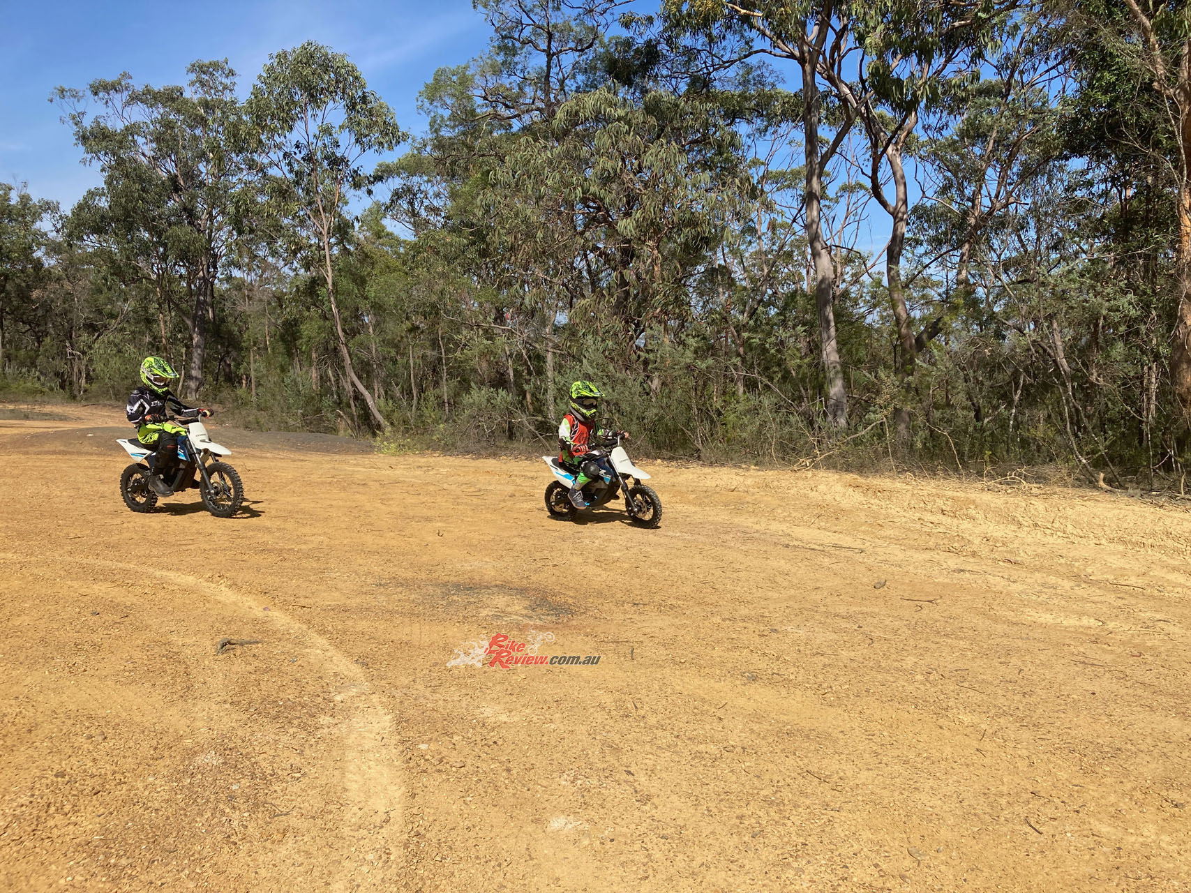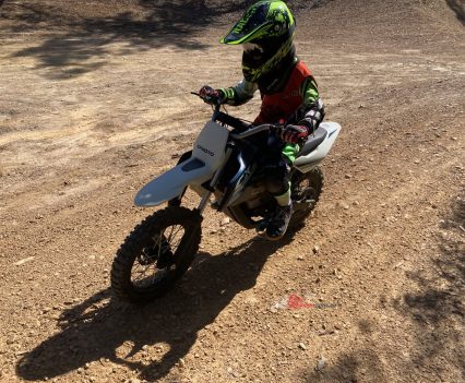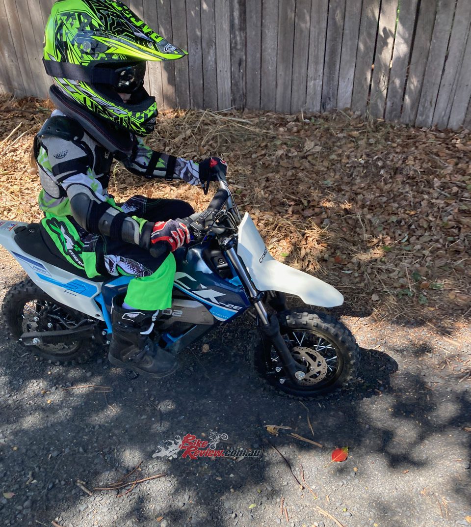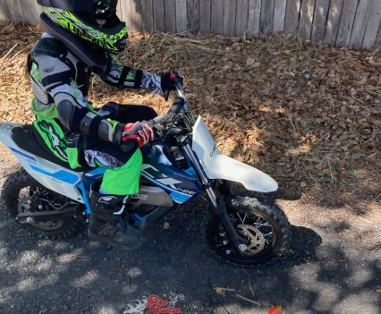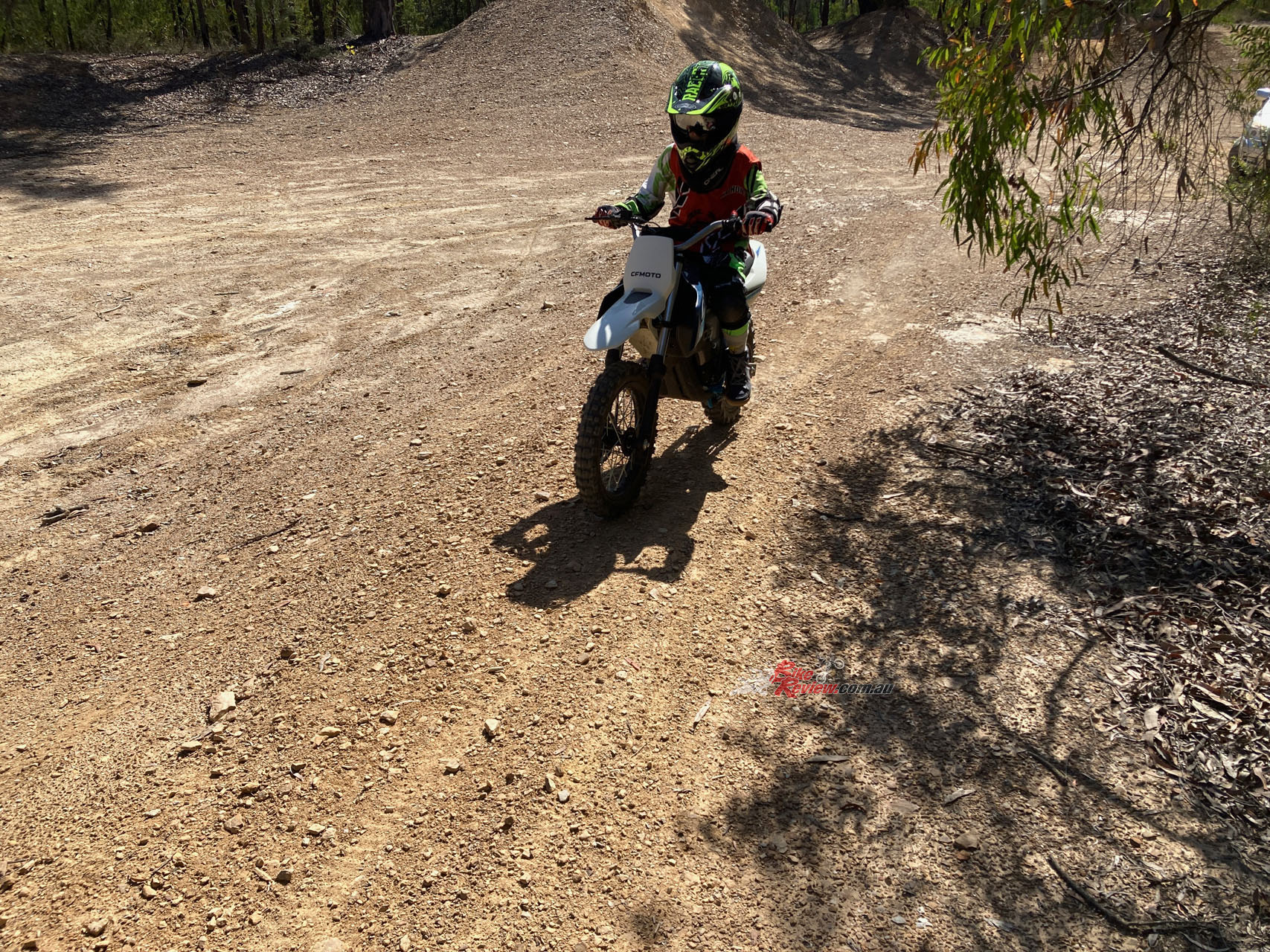 “I wish it had a little more power, just a bit more, it is slow up hills. The throttle is snappy in Mode 3 but the bike is slow in Mode 2, so I have to ride it with the snappy throttle. The brakes are good, the shock is really good too, better than the shock on my Torrot. and the forks don’t bottom out. The tyres slip around a lot on the loose surfaces. It’s more comfortable than the PW50 or KTM50 SX Junior was, and soaks up the bumps well and is fun riding in the single track trails and around the house and yard!”