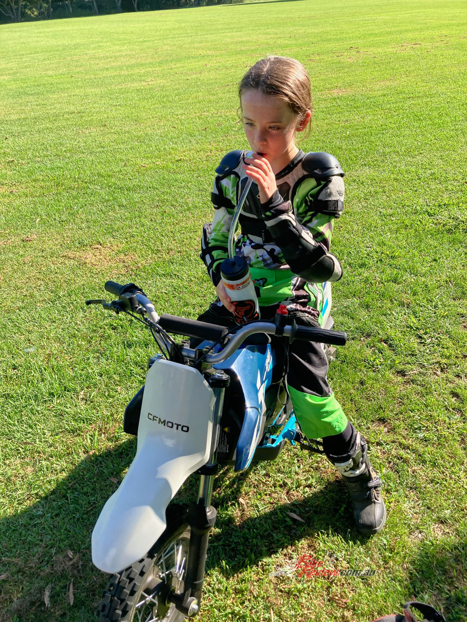 After a drink and a chat, we sent her back out to practice stopping drills, first with the back brake, then with the front, then with both. After that, we gave her full power and with a little kid on it who weighs a fair bit less than Anthony the 2E really zips along! Not enough to spin the tyre and damage grass, which is great, but plenty to be fun and it’s fast enough for this parent to watch anyway! Incredibly, another 30-minute run and I was beginning to wonder what is going on with the battery, having already surely exceeded the CFMOTO claimed range of 60km!