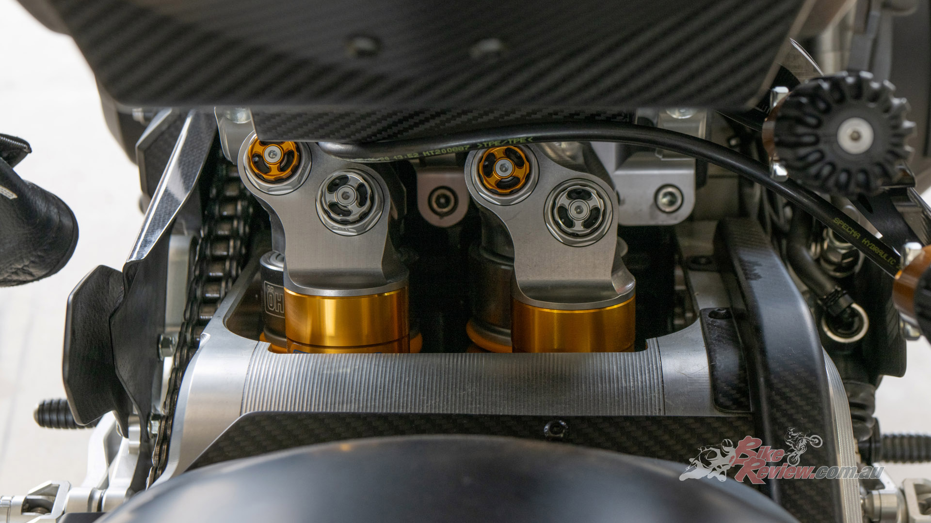 The bridge ensures the correct balance of rigidity between the left arm, where the suspension is connected. The front and rear swingarms are bolted directly to the engine so there is essentially no real frame needed. There is a pivot rod that attaches to the front swingarm and leads to the rear, where it can easily be adjusted for preload, rebound and compression via the Ohlins TTX36 shock. The rear swingarm also gets the Ohlins TTX36 shock and they sit side by side for easy access and look pretty trick sitting next to each other.