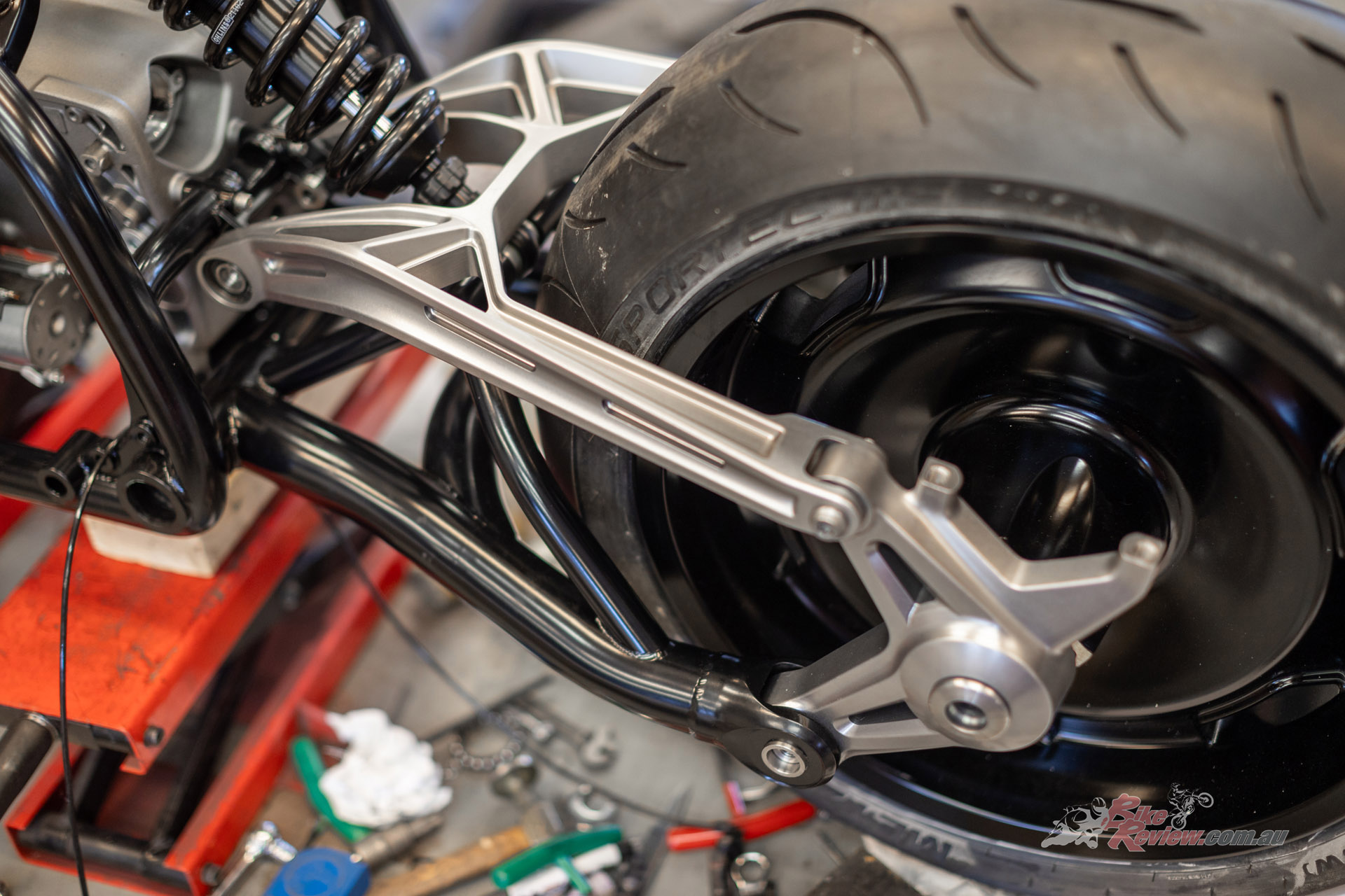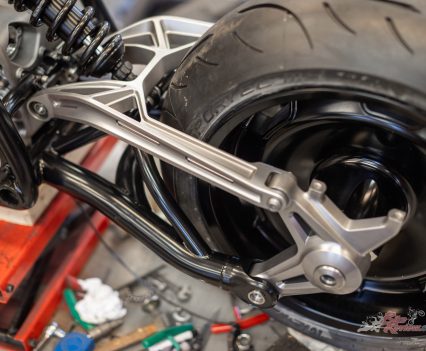 Brakes are from ISR with radially bolted brake calipers, each with six pistons on the twin discs at the front and four pistons on the single rear disc. The wheelbase at just over a metre and a half connects 200 rear and 120 front tyres on 17 inch wheels. But why an aluminium wheel at the rear but a wire-spoke wheel at the front?