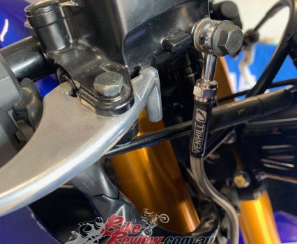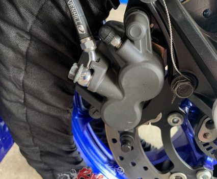 Note that removing it and unplugging its connector will show an error light on the dashboard – this light will not affect the running of the bike at all. Install the racing brake line set and bleed up using quality racing brake fluid. You will also need to drill and lockwire the front caliper bolts as this is a rule requirement.