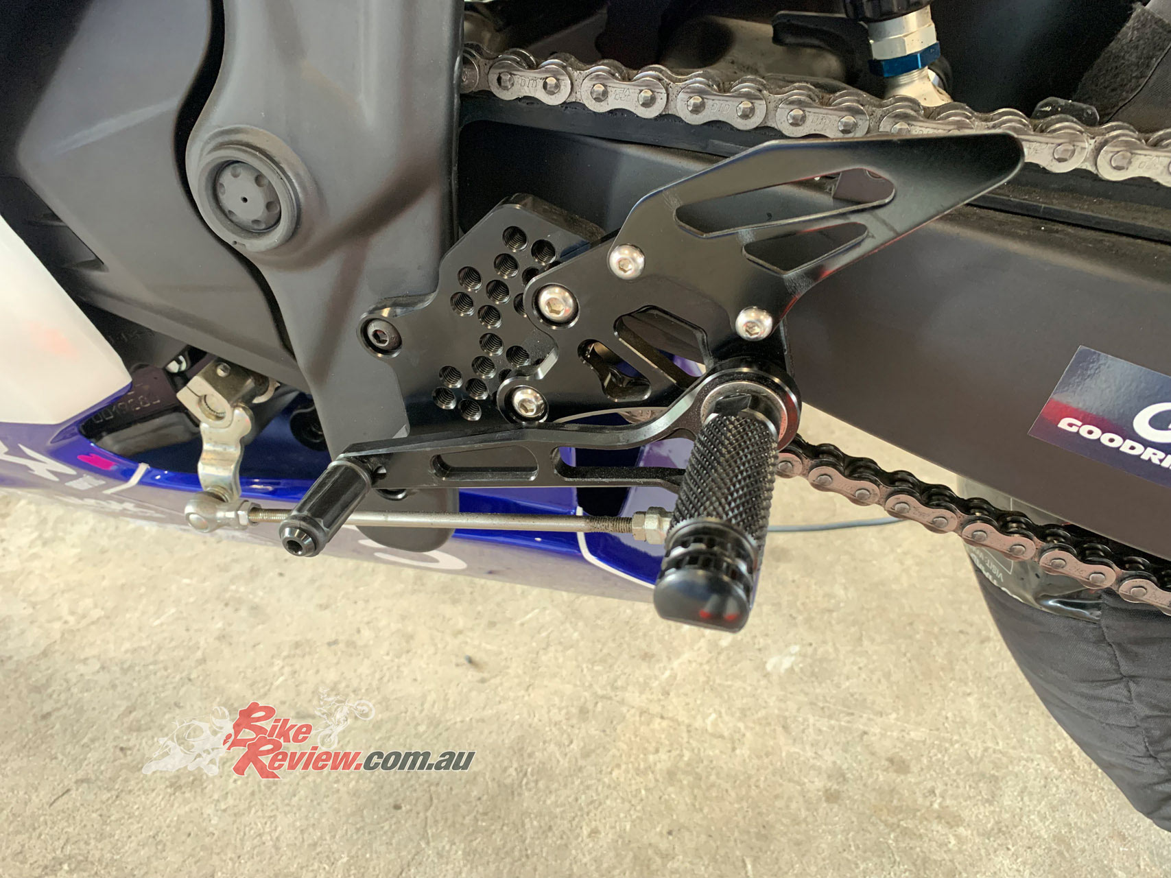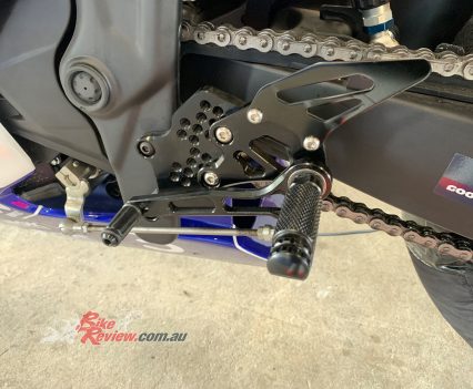 Remove the stock exhaust system and passenger foot pegs, the race exhaust will require a special mounting bracket made for it. Remove the footrest assemblies and install the racing rearsets kit – most kits should give you the option to install either in ‘race’ shift pattern (1 up, 5 down) or the standard street shift pattern.