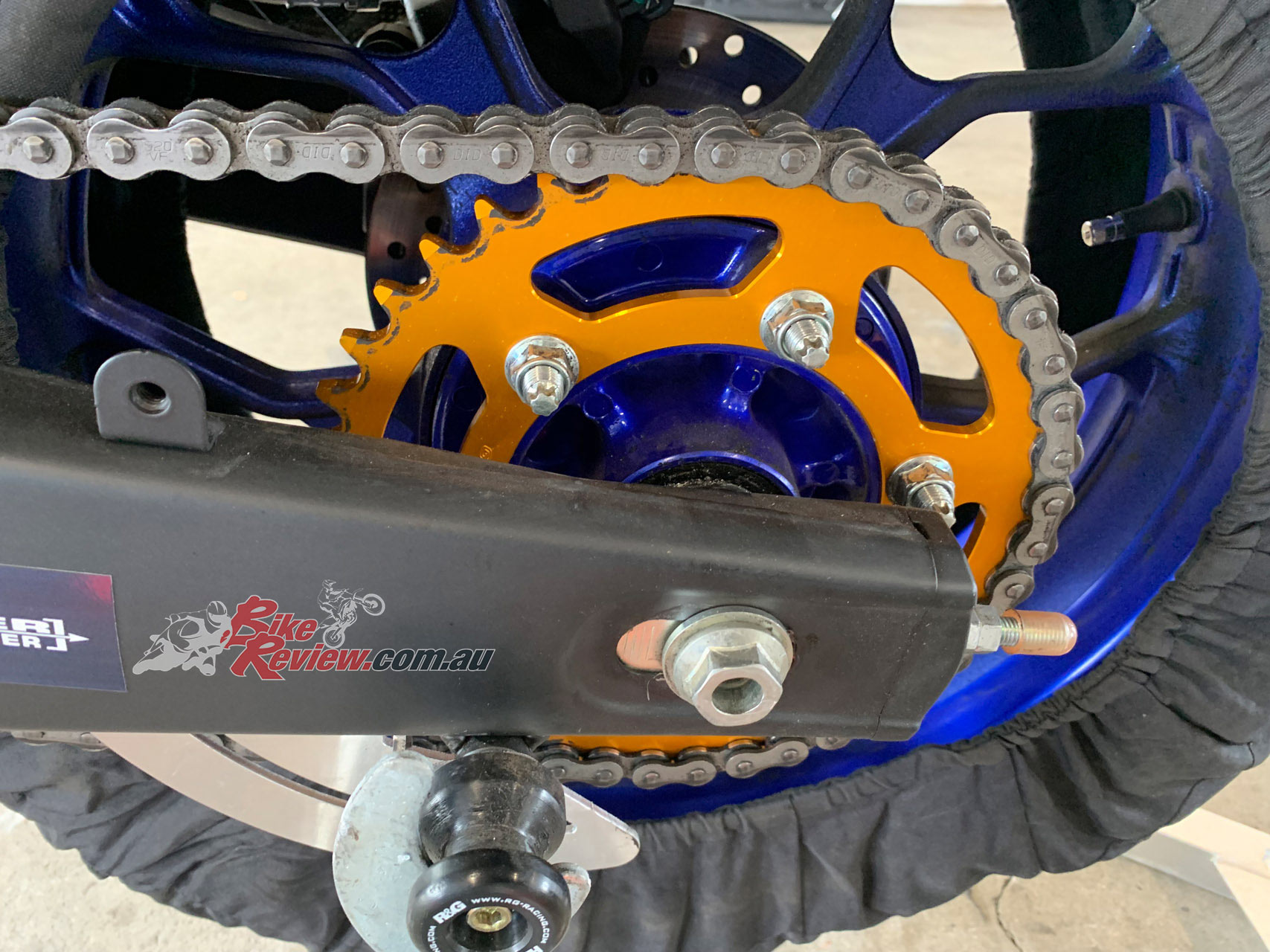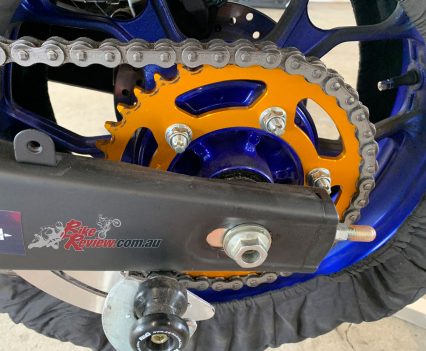 With the rear wheel out you can fit your preferred track gearing (gearing list attached for most Australian national circuits). We suggest not to refit the metal ring that encircles the sprocket bolts as it is not required for racing. It is desirable to purchase a selection of sprockets to allow you to setup for each track you race at. A lower chain guard is mandatory and can be fitted at this time. The front sprocket cover can be left off to make for easier sprocket changes.