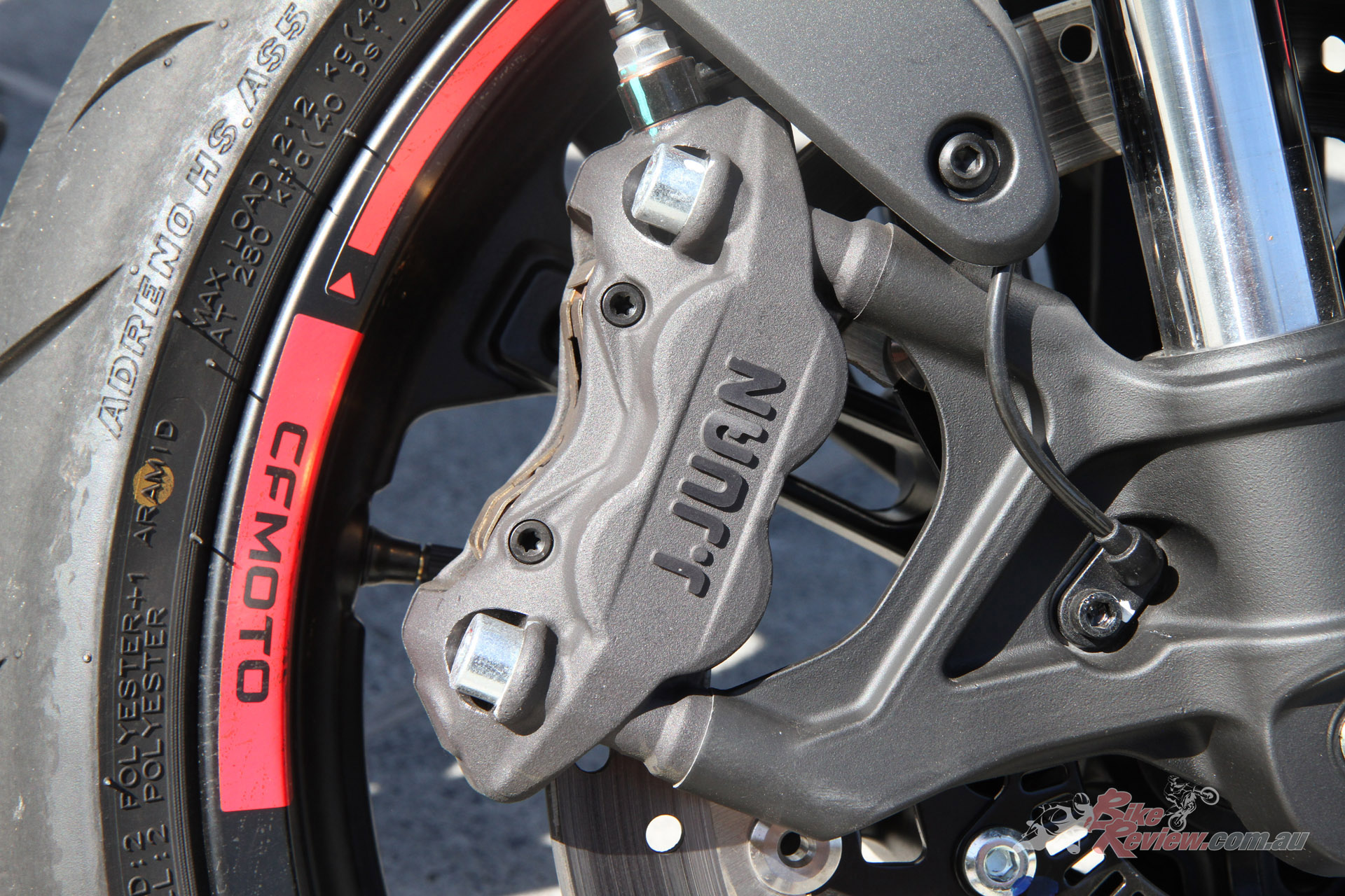 Brakes: J Juan four-piston radially mounted caliper, single 320mm floating disc, ABS (F) Single-piston caliper, 220mm disc (R)