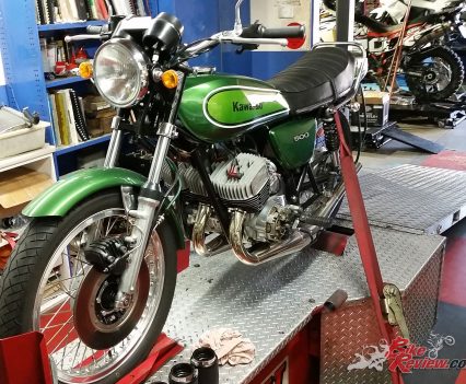 As soon as I saw the bike I knew I would own it, at that time I had no licence so I couldn’t legally ride the Kwaka, but I took it for a sneaky test up the back alley and was instantly hypnotised by the smell and more importantly the sound of the triple, sucking air through the three open bell mouths into the 28mm Mikuni carbs.