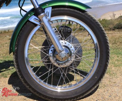 Brakes: single 296mm steel disc with single-piston calliper, single 180mm rear drum