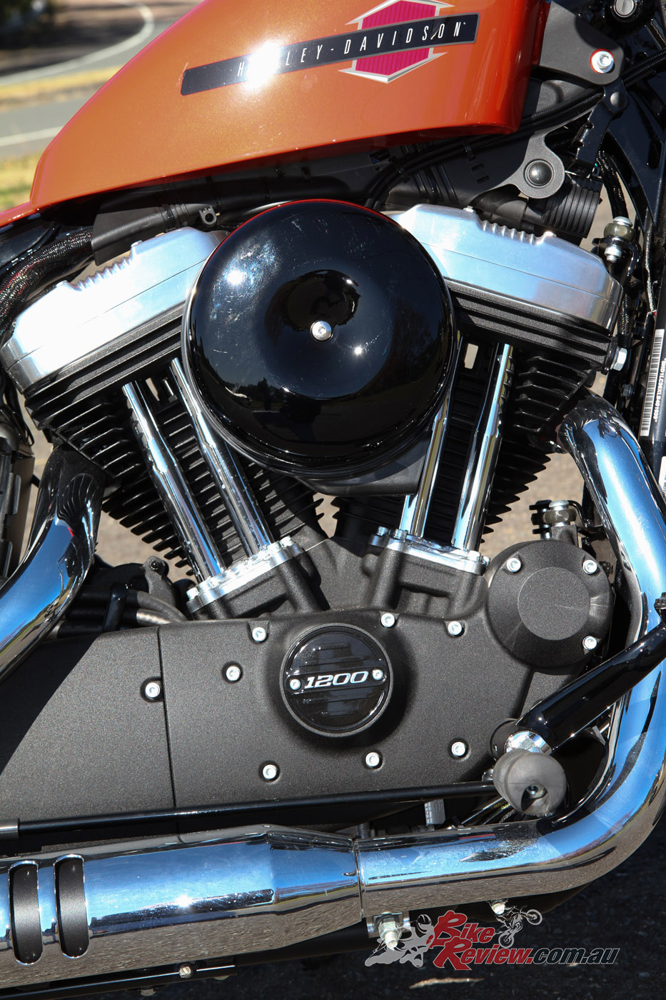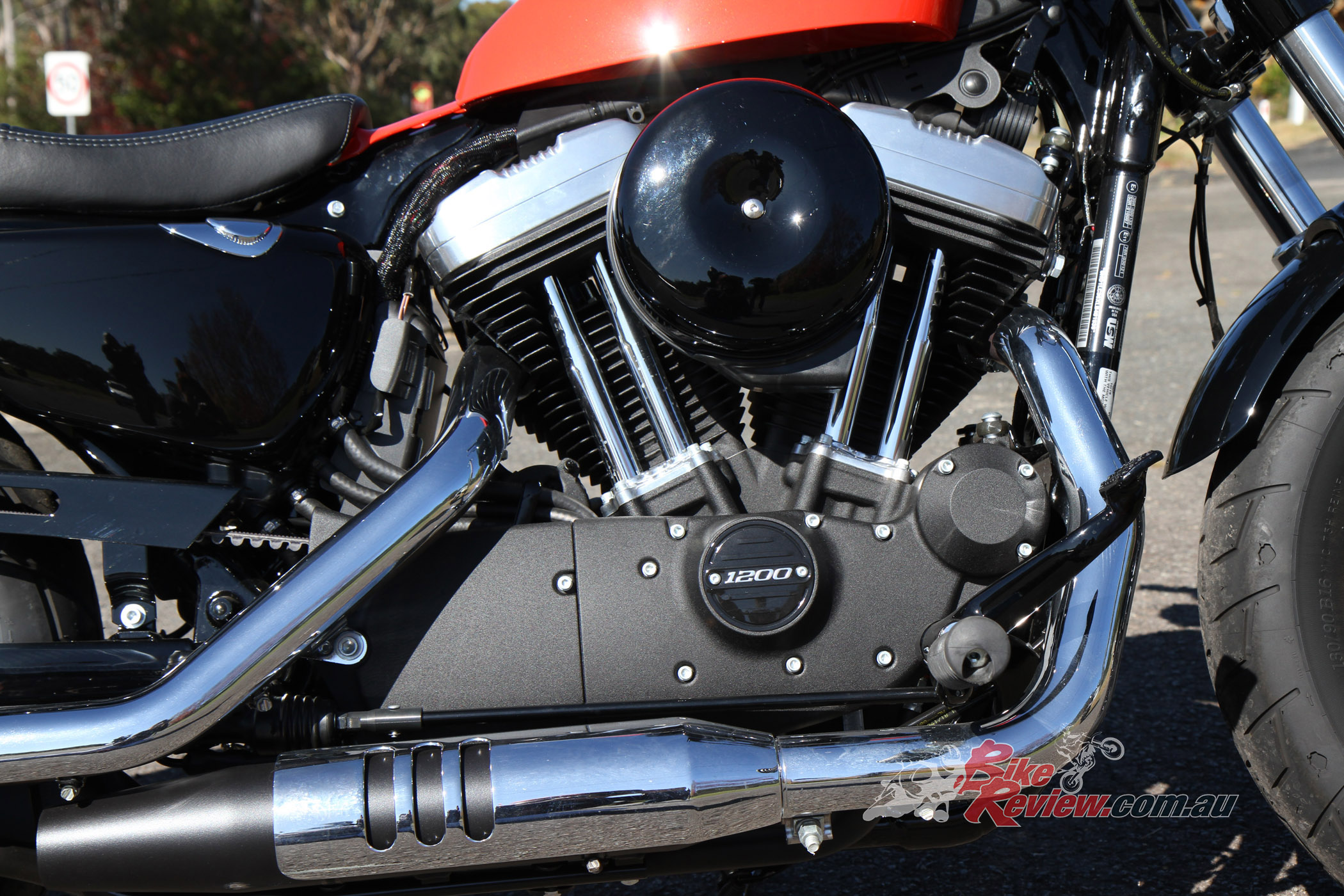 The Forty-Eight is powered by the popular Evolution 1202cc V-twin motor which produces 96Nm@3600rpm but produces that over a wide torque-curve, making it available in any gear at just about any speed. The air-cooled fuel injected (ESPFI) motor has a long stroke dimension of 88.9 x 96.8mm and runs a compression ratio of 10.0:1. With the five speed wide ratio gearbox and tall final 30/68 gearing, the Forty-Eight is happy between the 70km/h and 120km/h range.