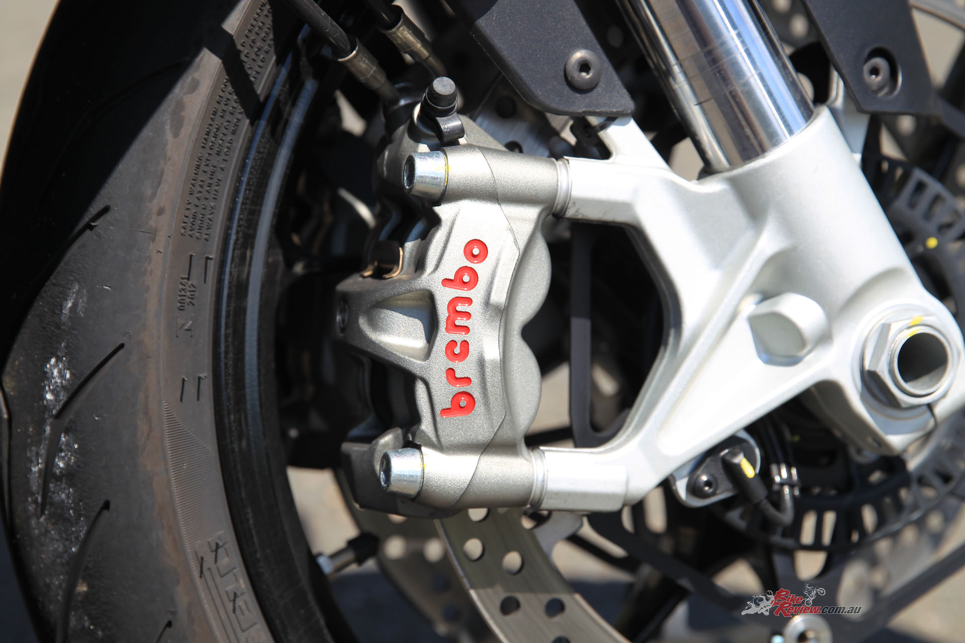 Brakes: 330mm rotor(s) (f), Brembo M50 monobloc calipers, Brembo master-cylinders, 220mm rotor (r), twin-piston Brembo caliper