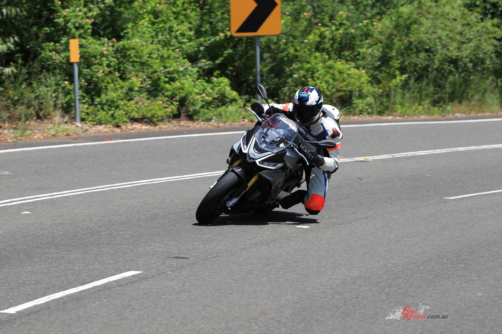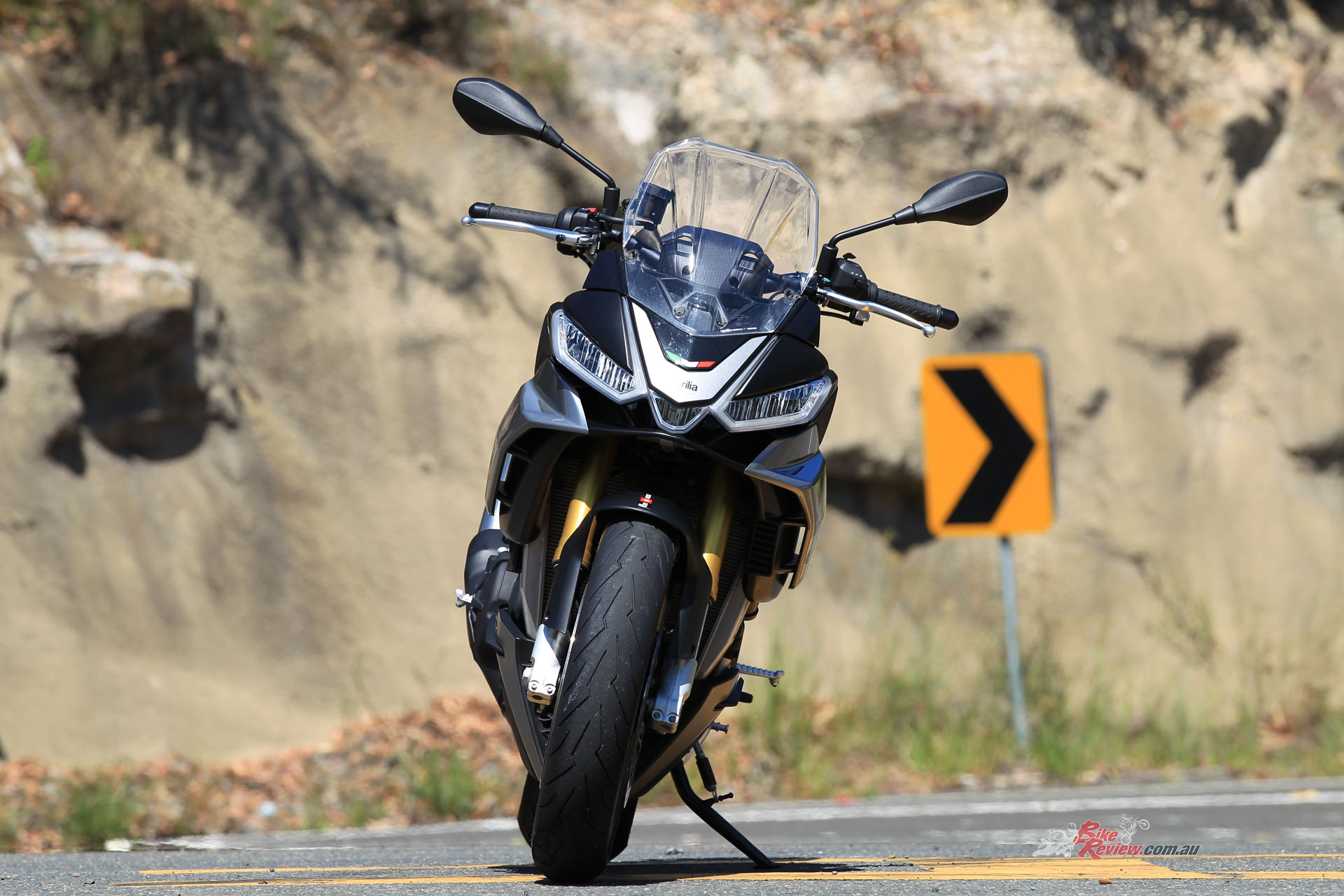 Summarising handling, it’s comfortable and soft suspension-wise, possibly too soft for some really hard riding sports riders, but the geometry of the chassis allows the bike to get aways with the soft suspension and still steer and corner well, and even remain stable on the brakes. And the brakes are huge… We are talking standard suspension settings though, and I feel with a bit of extra preload and damping, within the stock availability, the Tuono could be just about spot on for a sports naked that needs to isolate the rider from our terrible, no horrendous, roads here in Australia…